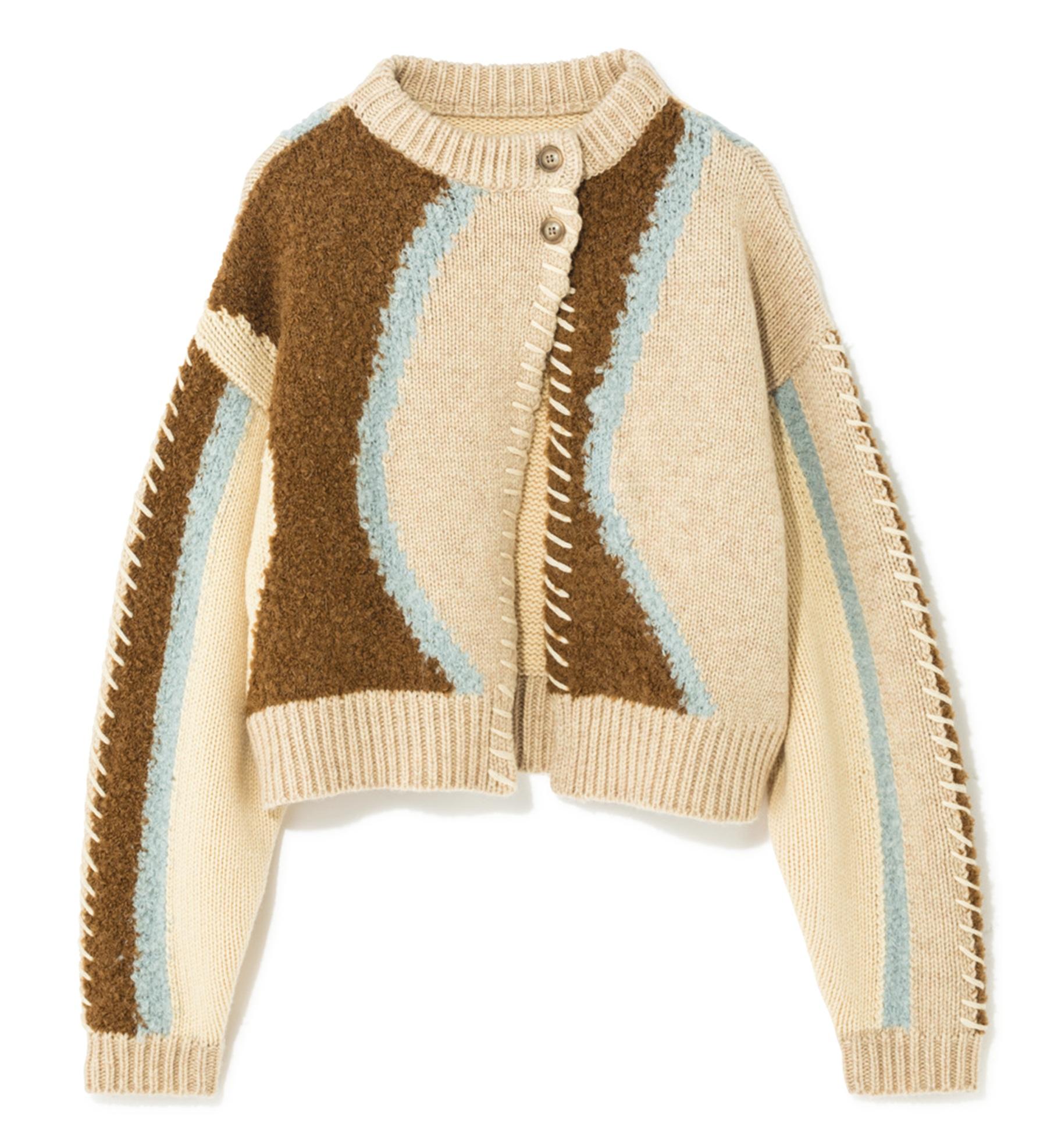 アシンメトリーなパッチワーク風のデザインが個性を放つ、1枚でキマるカーディガン。