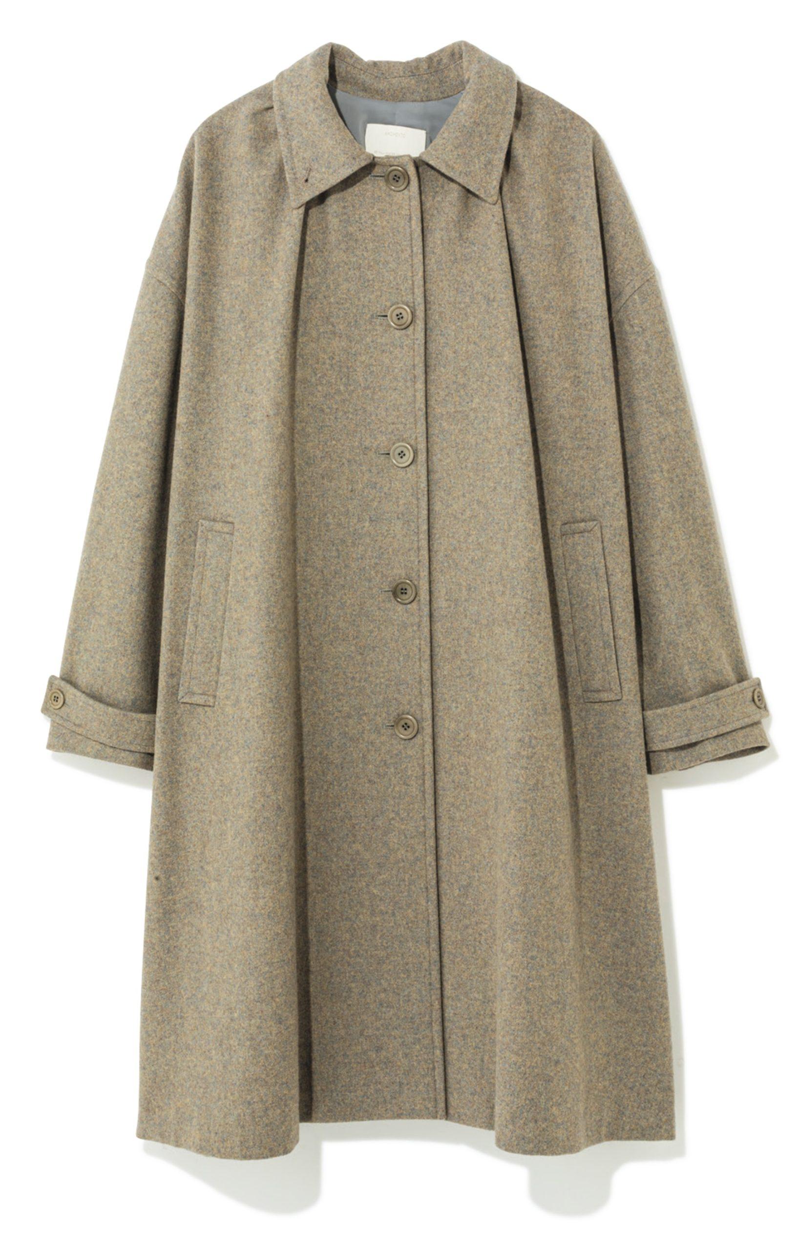 ウールを混紡した暖かな一枚は、立体感のある首元のシャーリングディテールが特徴的。下にいくほど広がるフレアシルエットはゆったりとした着心地で、余裕を感じさせる。