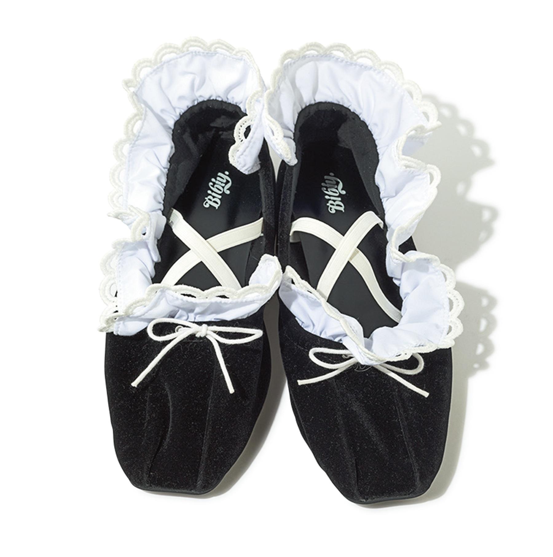 スクエアトゥのバレエシューズにピコレースをあしらったフリルを重ねた、大人の甘さとストーリーを感じさせる一足。甲の部分にゴムがあることで歩きやすいところも嬉しい。