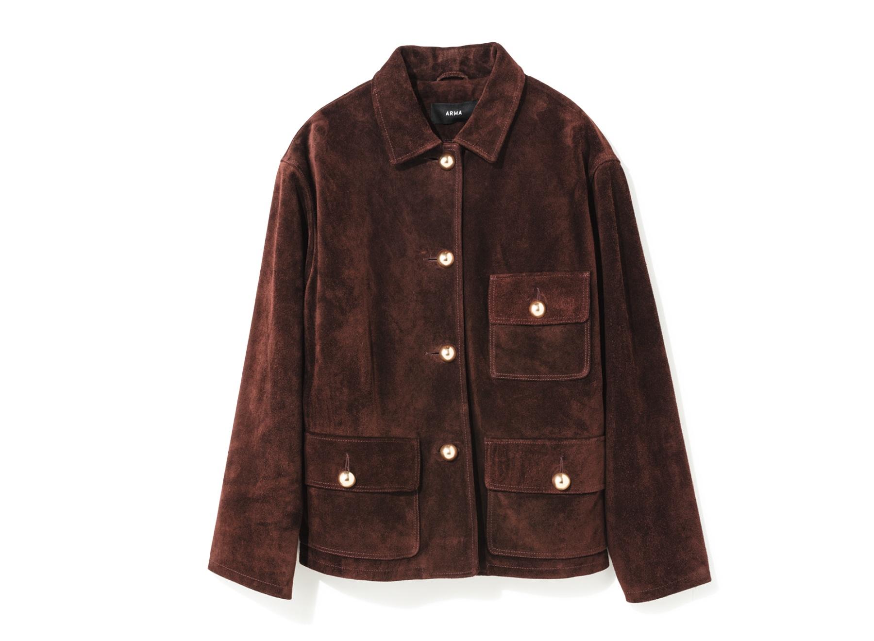 大きな金ボタンがクラシックなムードを醸し出す、レザーブランド『アルマ』の牛革スエードジャケット。ベルベットのような光沢のある質感は、身に纏うだけでうっとり。¥143,000(エストネーション TEL. 0120-503-971)
