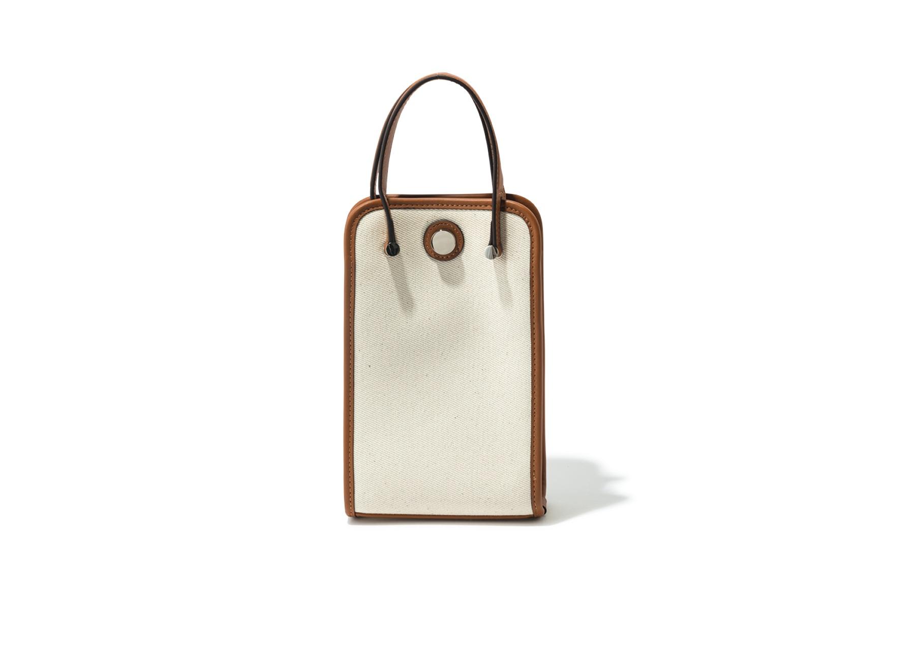 リサイクルポリエステル×牛革の異素材使いバッグ。撥水加工が施され、雨の日の外出も安心。ストラップ付き。W15×H23×マチ6.5cm ¥25,300(SOMEWHERE STUDIO/エルディスト ショールーム TEL. 03-4361-7243)