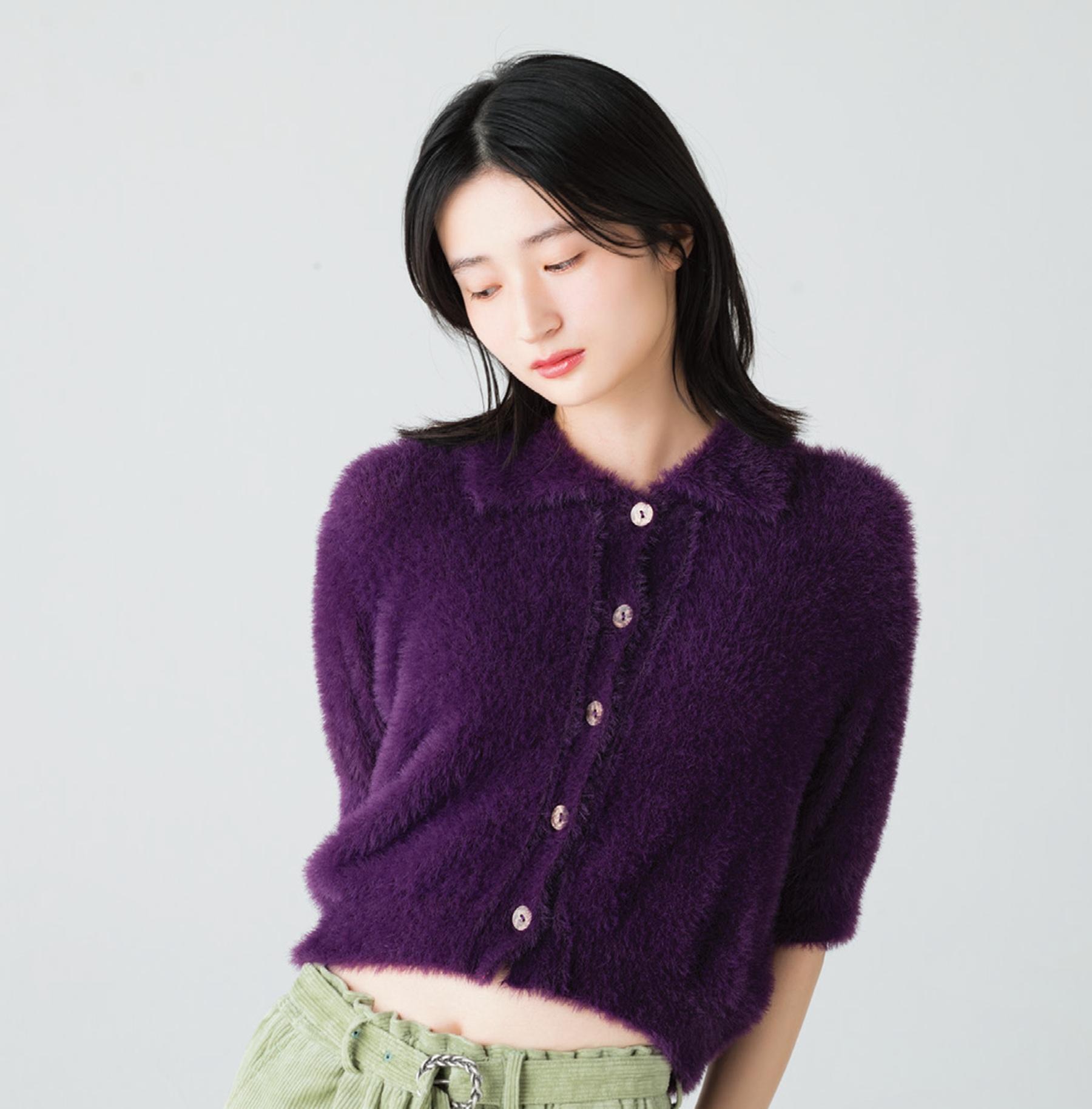 パープルの発色が美しい、ファー素材の半袖ニットカーディガン。コンパクトなクロップド丈でバランスよく着こなせ、トップスとしても羽織りとしても重宝。¥39,600(BAUM UND PFERDGARTEN/S&T TEL. 03-4530-3241)