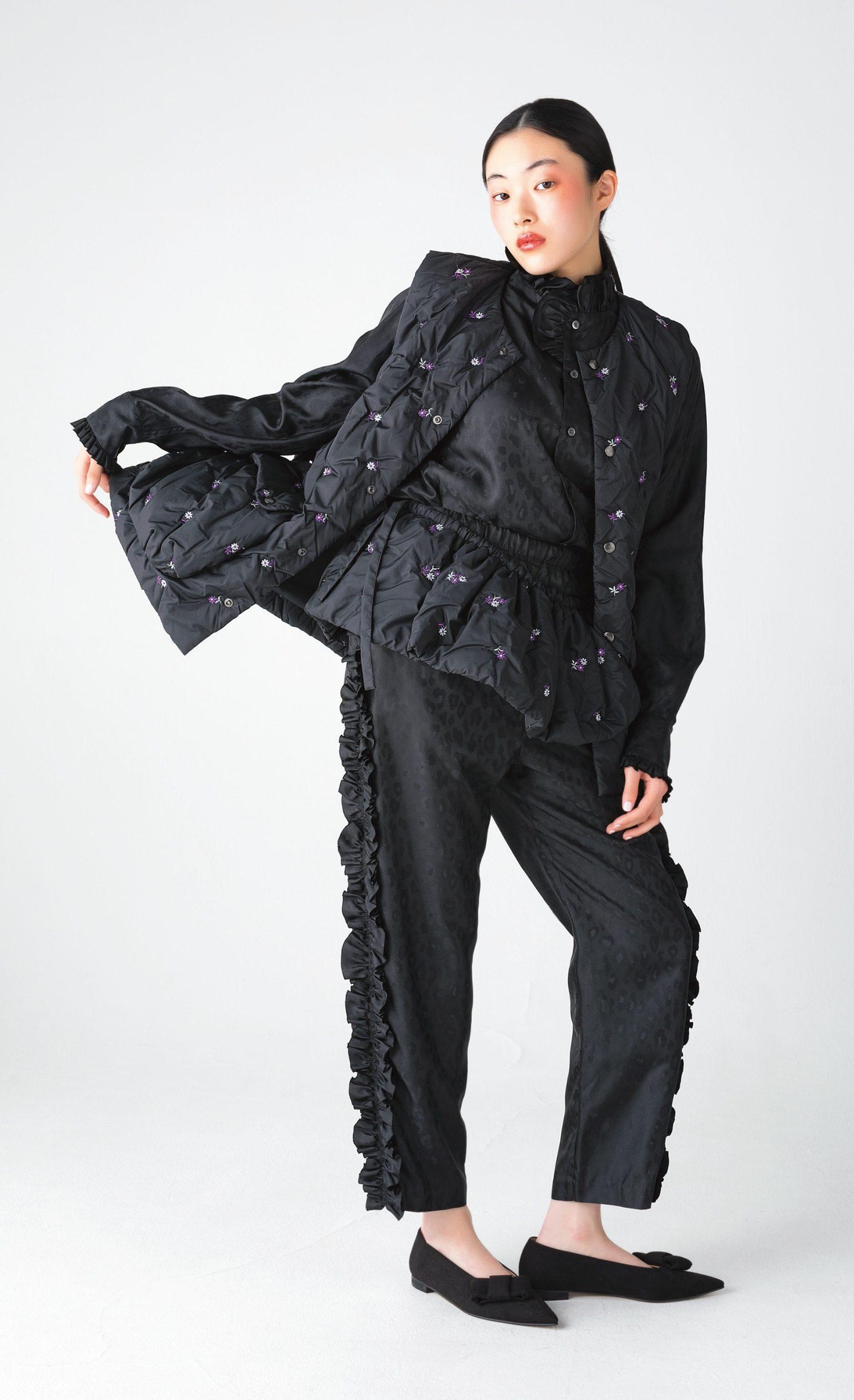 高密度なポリエステルタフタに小花刺繍を施したベストは、中綿入りで暖かさも格別。イギリスのモーターサイクルジャケットからインスピレーションを得た、大きなキャリーポケットや共布ベルトもポイント。同柄のエプロンをプラスすれば、オリジナリティがさらに加速!ベスト¥56,100 エプロン¥27,500 シャツ¥33,000 パンツ¥33,000 パンプス¥35,200(以上ロドリリオン/ネペンテス ウーマン トウキョウ TEL. 03-5962-7721)