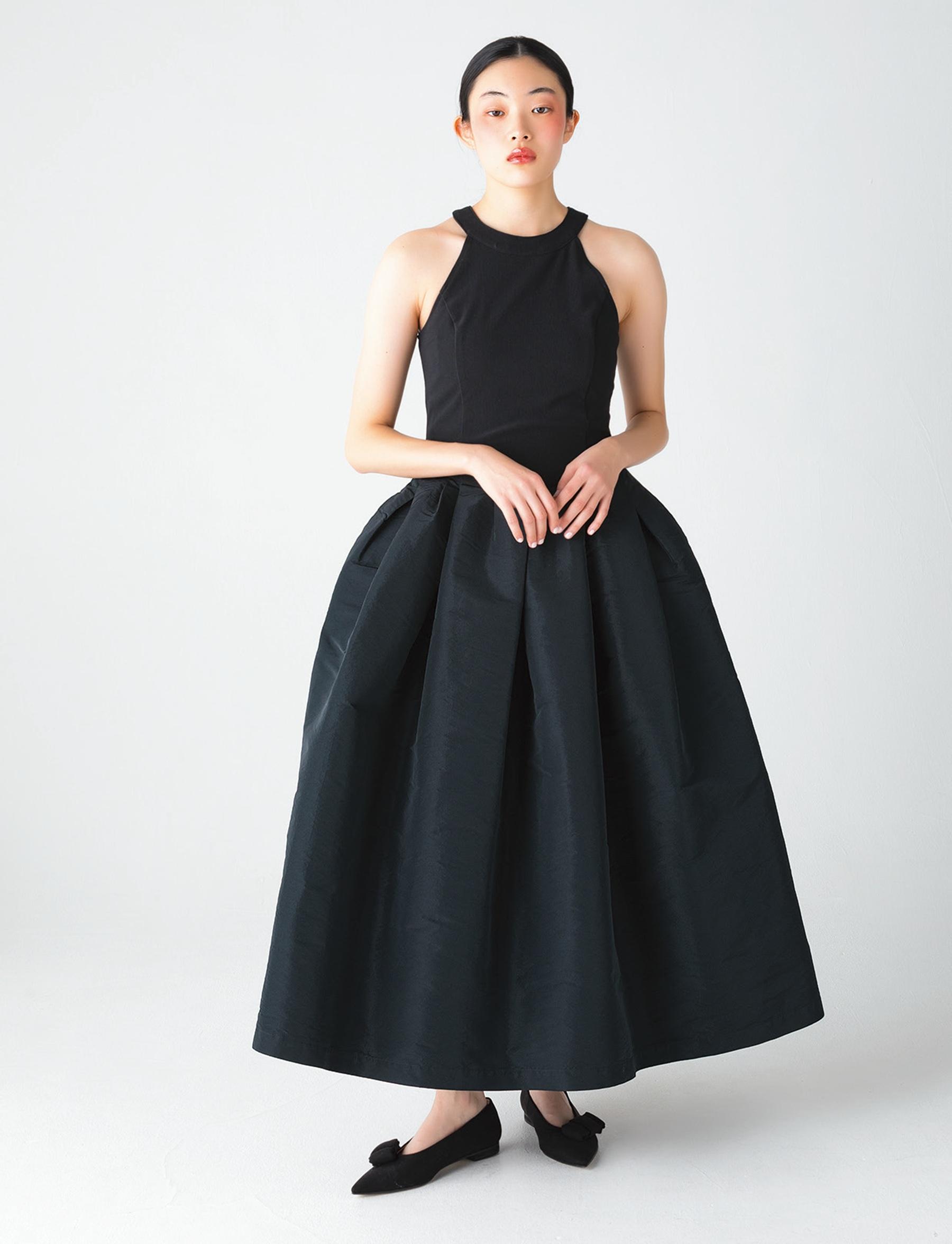 体にフィットするアメリカンスリーブのカットソーと、ハリのあるタフタ素材のスカートをドッキングしたワンピース。ふんわり広がるボリューミーなフォルムで、ドラマティックな印象に。¥48,000(シーニュ)