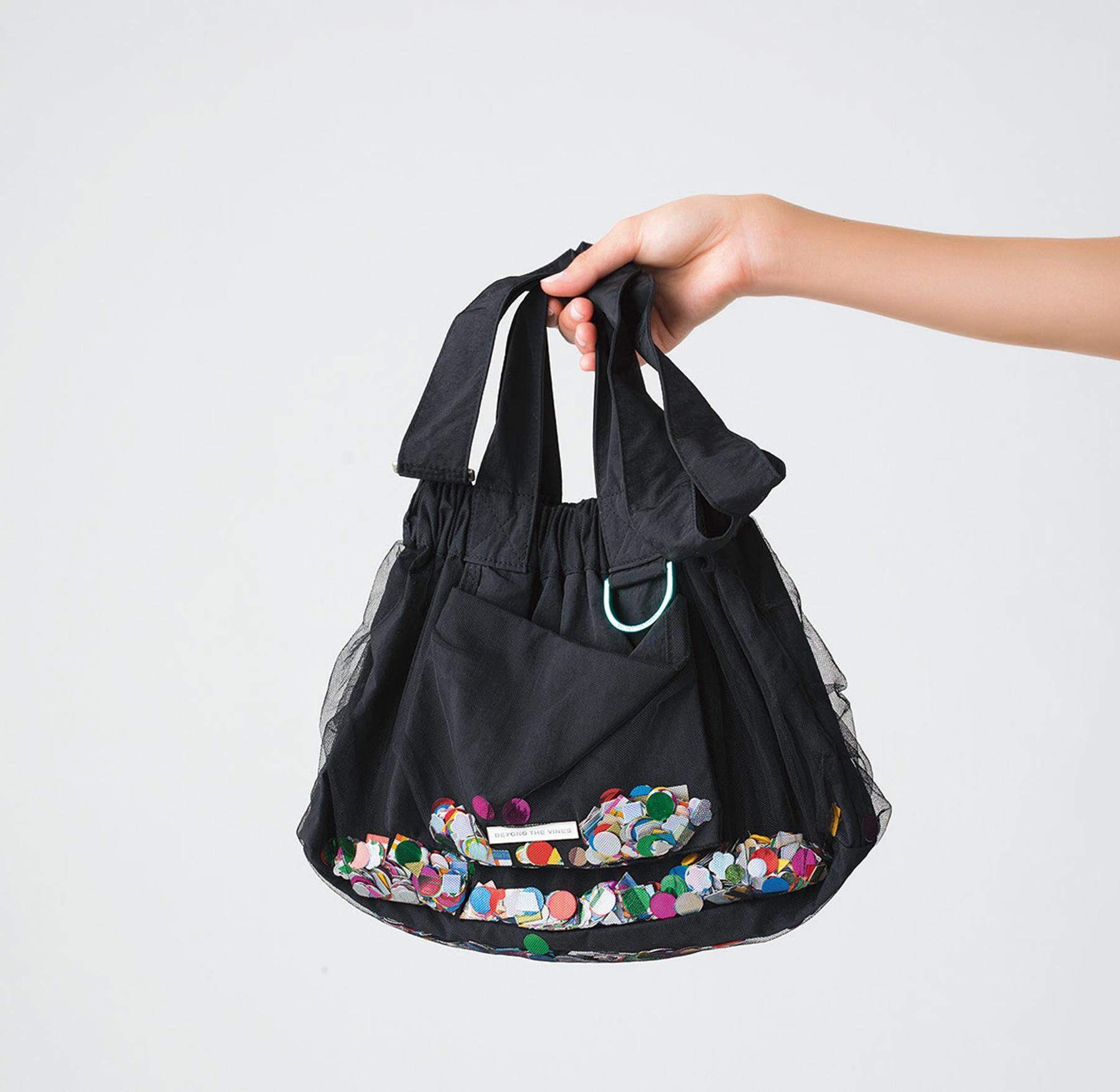 耐久性に優れたナイロンにメッシュを重ね、その間に色とりどりの紙吹雪をちりばめたプレイフルなデザイン。マグネットボタンで開閉もスムーズ。白と水色もあり。¥14,290(ビヨンド ザ バインズ/リディア TEL. 03-3797-3200)