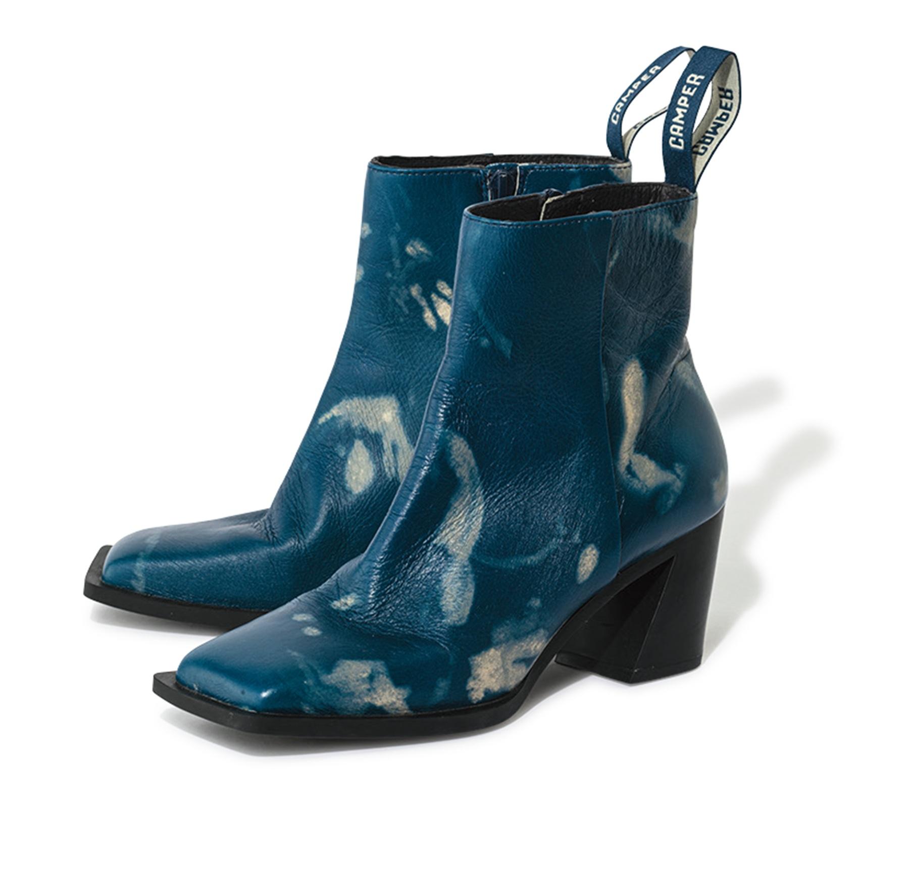 シワ加工を施したパテントレザーに不規則なプリントをON。カウボーイブーツのようなシャープなヒールやスクエアトゥもクール! ヒール高7.3cm ¥41,800(カンペール/カンペールジャパン TEL. 03-5412-1844)
