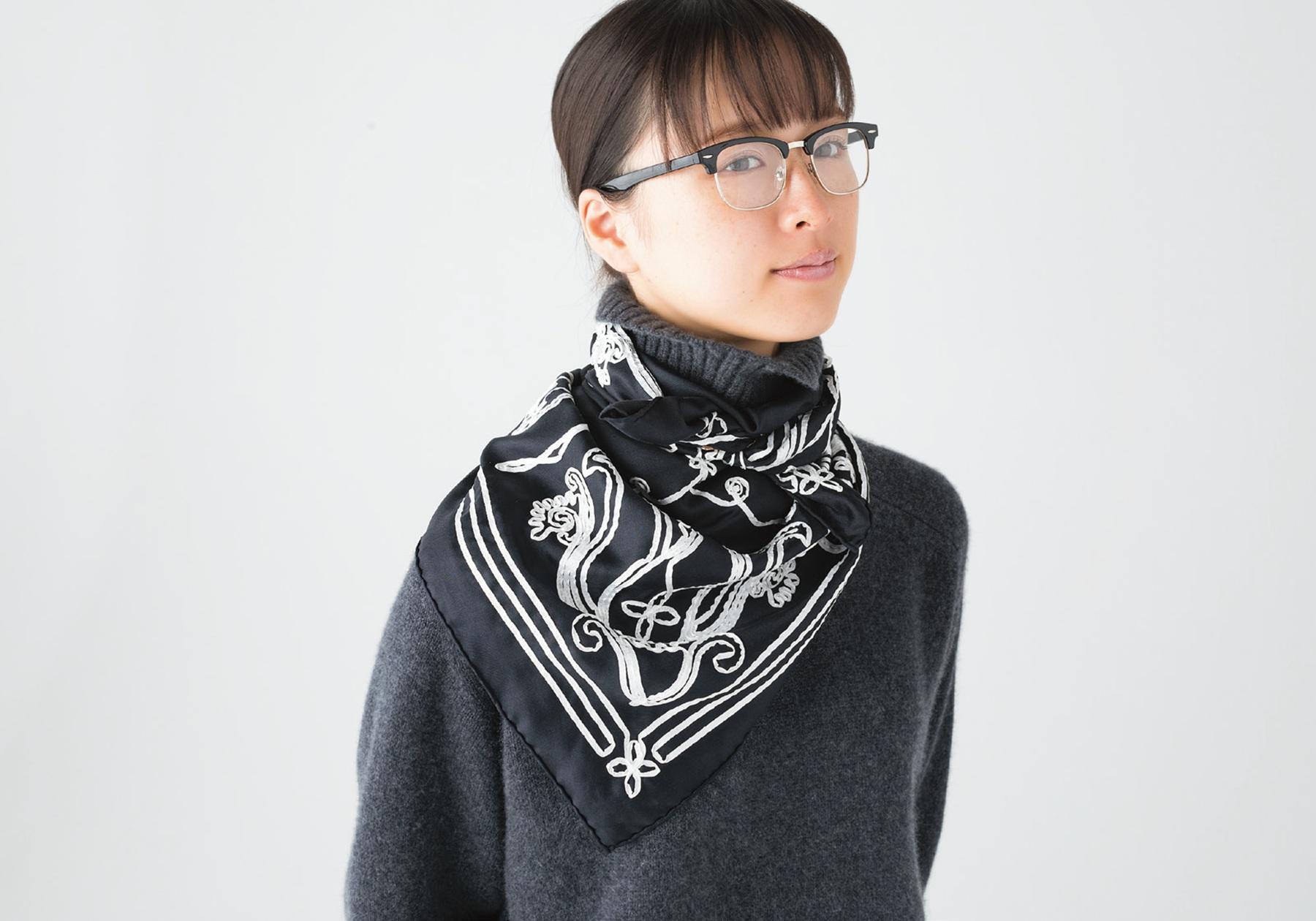 ヴィンテージのバンダナ柄を落とし込んだ。リバーシブルで使える。スカーフ 90×90cm ¥35,200(アソース メレ/アイネックス TEL. 03-5728-1190) メガネ ¥3,740(リリー ブラウン/リリー ブラウン ルミネエスト新宿店 TEL. 03-6457-8555)