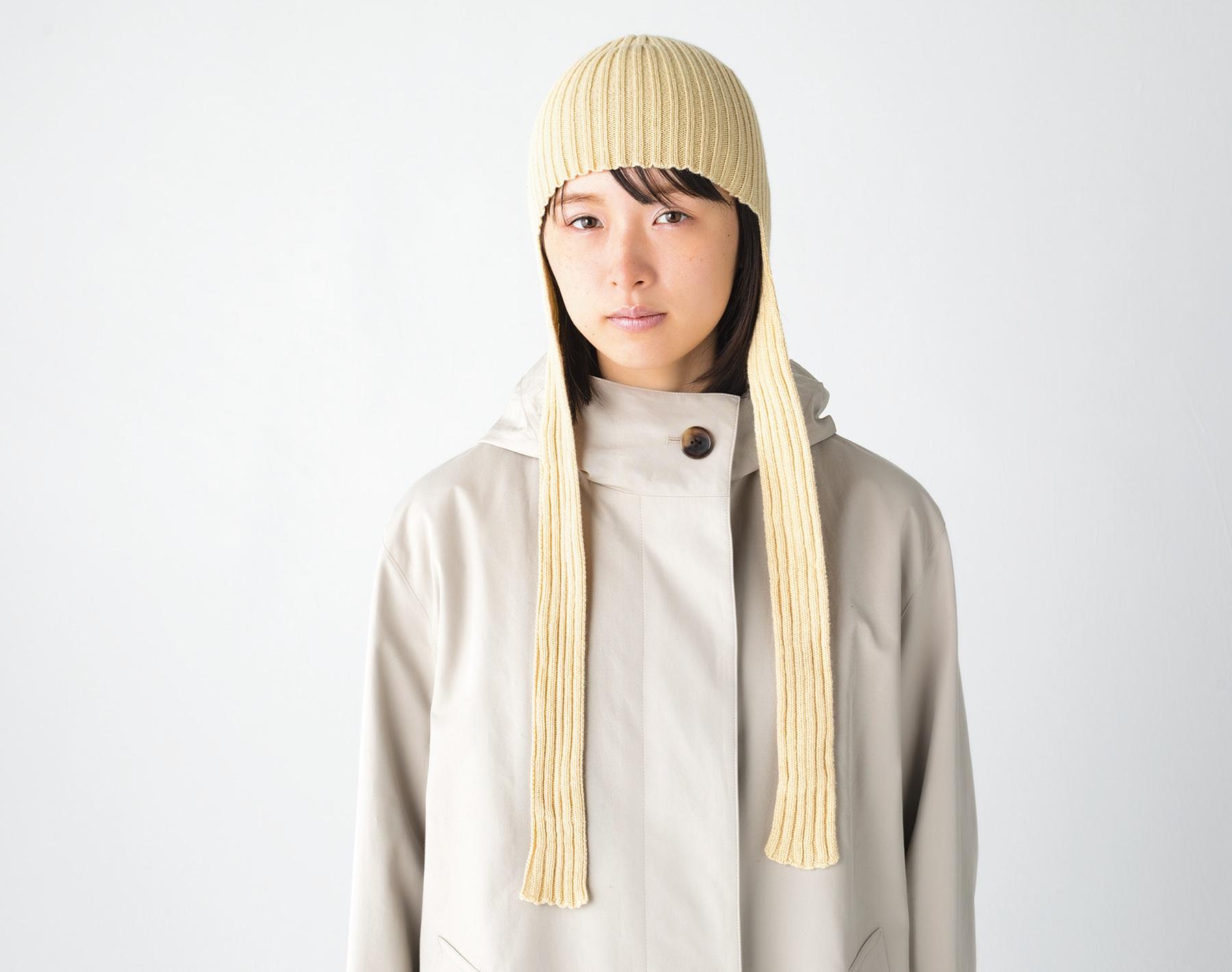 上質なカシミアのニットキャップは、後ろが長くなっていて首元もあったか。フードマフラーのようにも使える。¥18,700(ババコ info@babaco.jp) コート¥120,000(マーガレット・ハウエル TEL. 03-5785-6445)