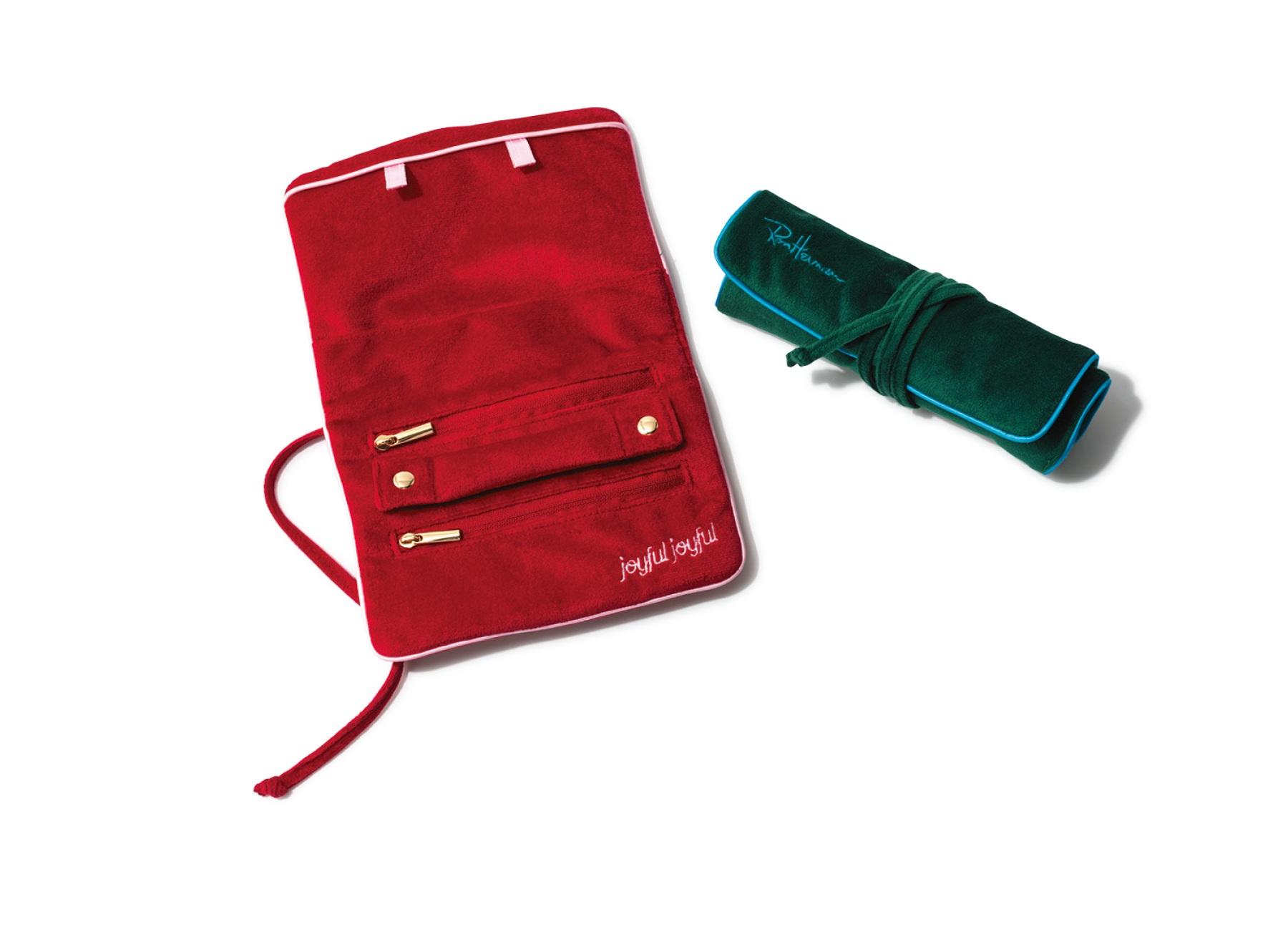 リングバーや仕切りポケットがついたベロア地のジュエリーポーチ。「joyful joyful」(赤)、「oh! what fun」(緑)というハッピーなメッセージ刺繍入り。17×12.5cm各 ¥14,300(ロンハーマン TEL. 0120-983-781)