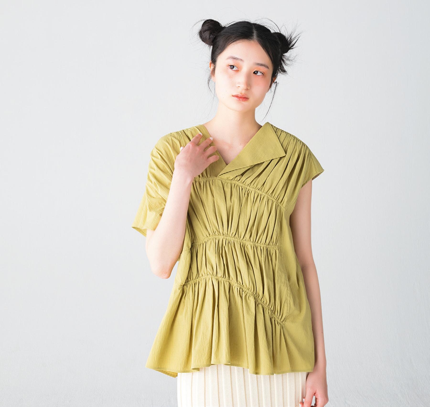 ソフトなテクスチャーのコットンジョーゼットを使用。フェミニンな風合いながら、不規則なギャザーを大胆に配したことで、甘くなりすぎず、モダンな雰囲気にシフト。プルオーバー ¥60,500(アキラナカ TEL. 03-6379-4878)