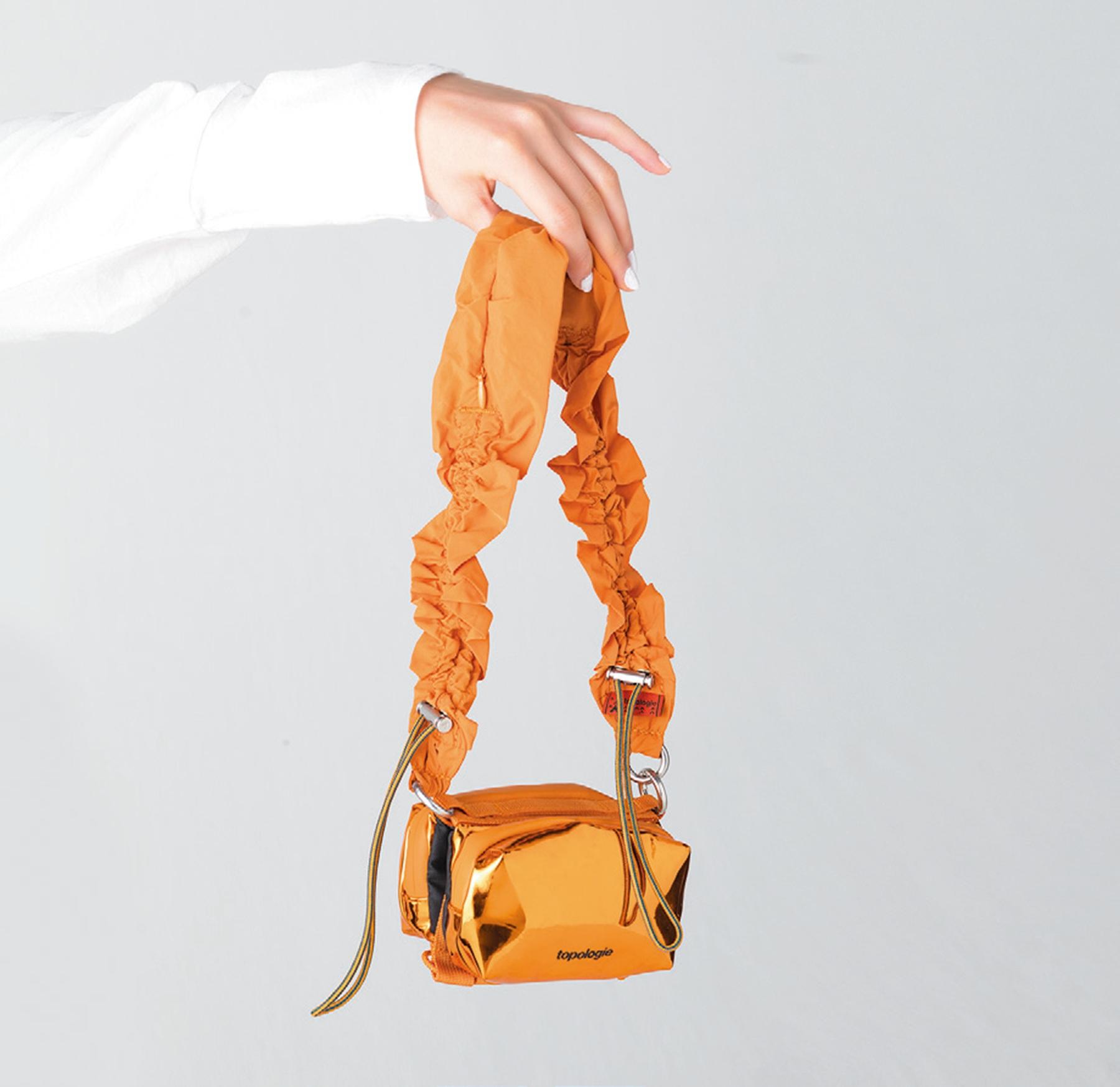 バッグ本体とストラップは別売りで、自由にカスタム可能。キャッチーなギャザーストラップが装いのスパイスに。ストラップ ¥12,100 バッグ ¥7,810(共にトポロジー/トポロジー フラッグシップショップ TEL. 03-6427-4460) トップス ¥30,800(CINOH/MOULD)