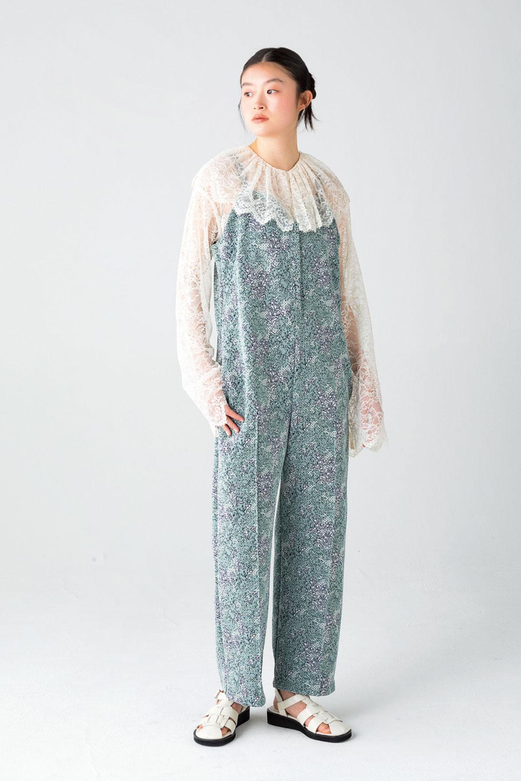 繊細なジャカード織で表現された花柄が目を惹く。厚みのある生地で型崩れしにくく、美しいシルエットをキープ。オールインワン ¥61,600(フミエタナカ/ドール TEL. 03-4361-8240) ブラウス ¥28,000(Uhr/Uhr Online Store)
