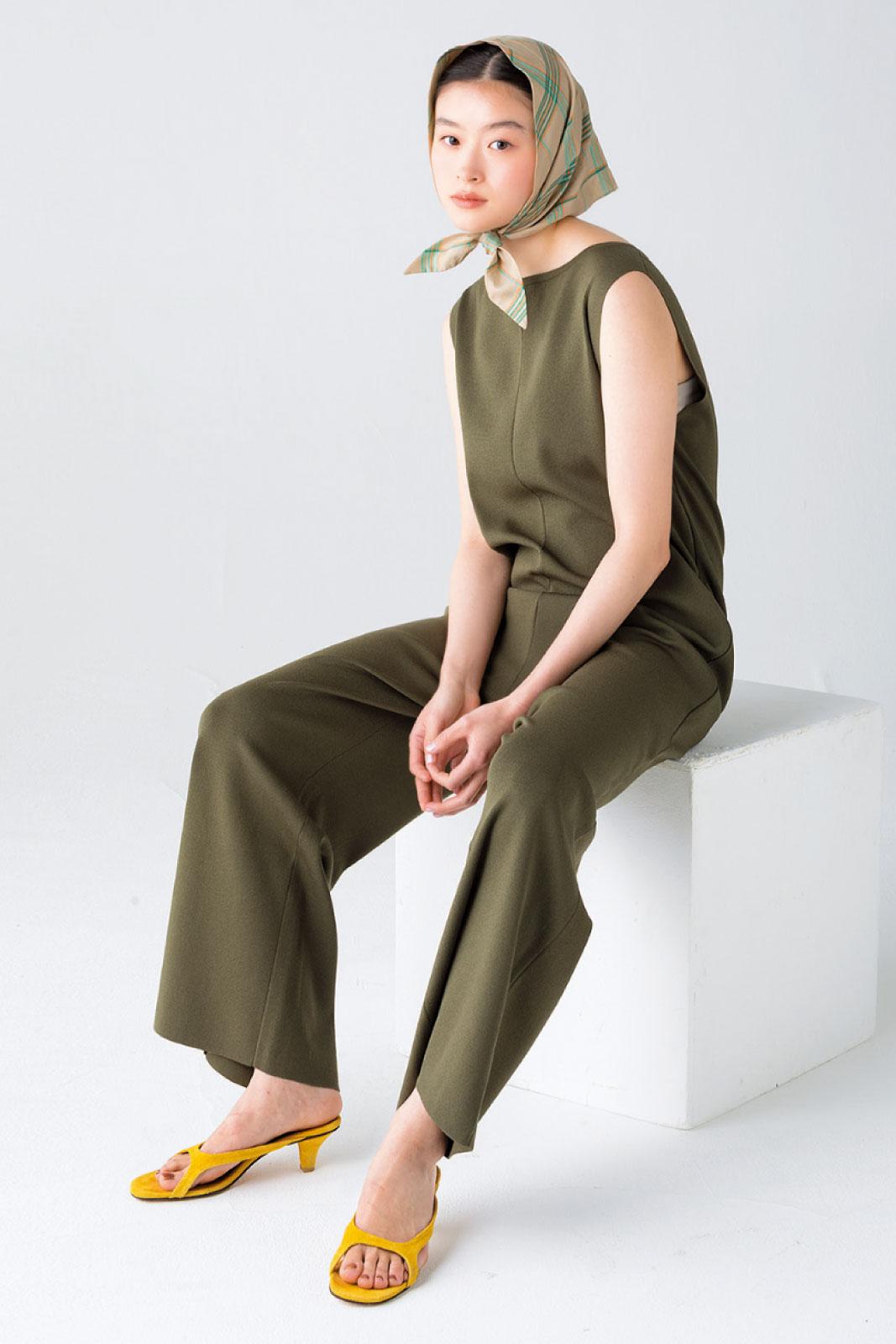 さらりとした着心地。オールインワン ¥20,900(ビューティー&ユース/ビューティー&ユース ユナイテッドアローズ 丸の内店 TEL. 03-6212-1500) スカーフ ¥13,200(メゾンドリリス/ジャーナルスタンダード レリューム ルミネ新宿店 TEL. 03-5909-4675) サンダル ¥46,200(ジェーン スミス/ジョン メイソン スミス ジェーン スミスストア TEL. 03-5738-7721)