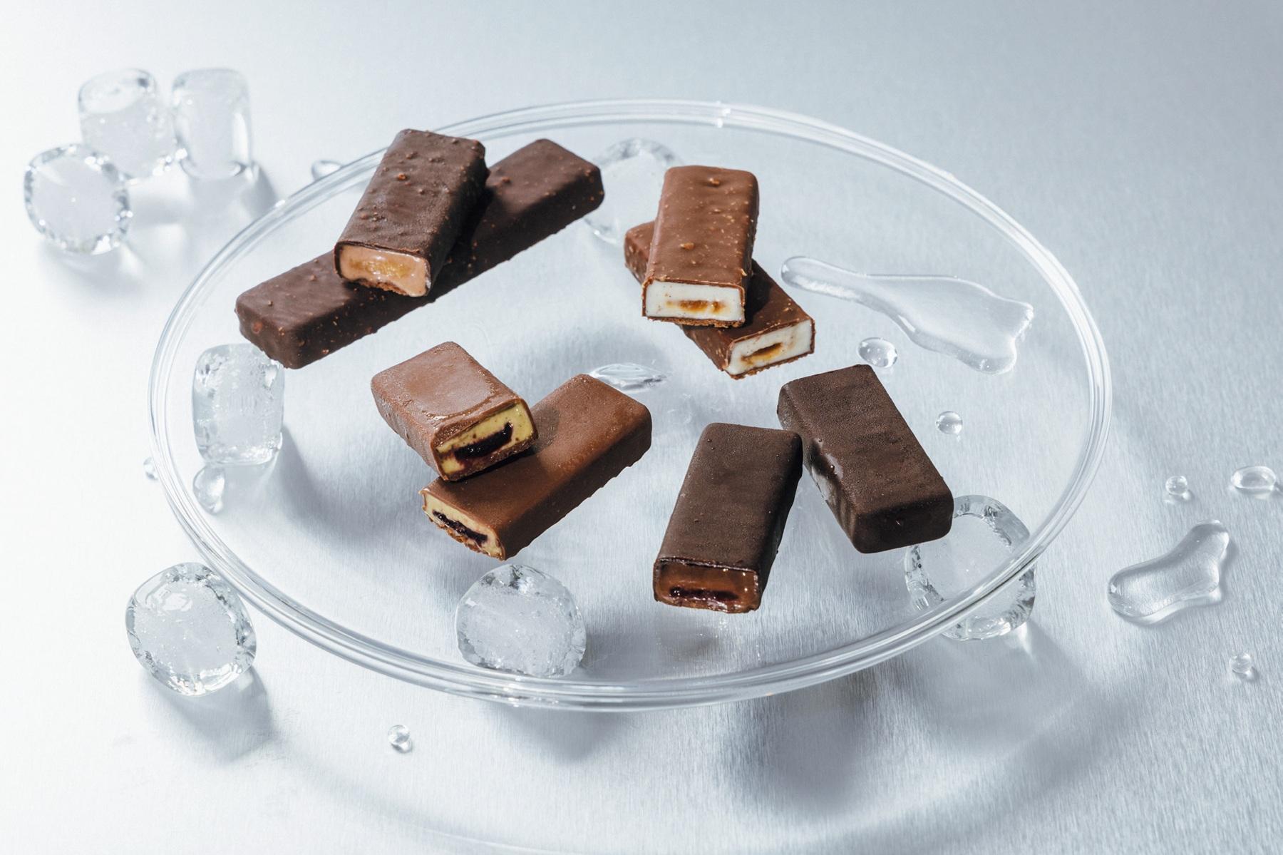 「-18°Cの冷凍状態を維持しながら、パーツごとに違う食感を出すのが大変でした」とダヴィッドさん。たとえばコーティングのチョコはパリッとしつつ齧った途端にアイスと溶けるよう、融点が低いカカオバターを混ぜる、なんて緻密な工夫があちこちに。「ヴァニーユ&シトロン」のバーでは、「レモンはコンフィにしてさらにキャラメリゼもすることで、酸味をほどよく抑え、深味を引き出すんです」。職人のクリエイティビティと繊細な手仕事が生む、アイスとショコラの新たな至福がここにある!