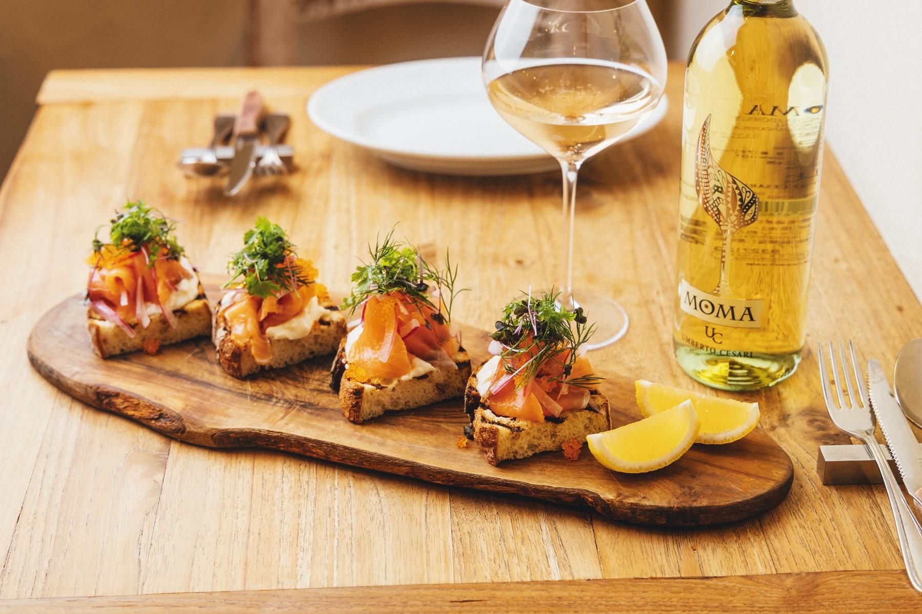 サーモンと赤玉ねぎのスライスをマリネした自家製スモークサーモンとストラッチャテッラのブルスケッタ1枚¥500(注文は2枚~。写真は4枚)。モマ・ビアンコ 2023(グラス)¥1,200。