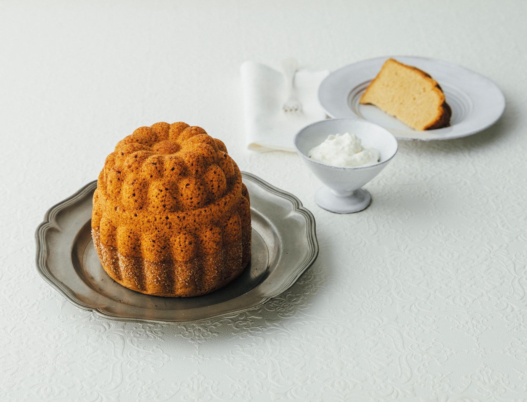 「ビスキュイ・サヴォワ」(直径約15cm、3200円)。ユニークな形はお城をかたどったもの。「ガトー・ドゥ・サヴォワ」と呼ばれることも。サヴォワ名産の香草リキュールを効かせた生クリーム(300円)をつけると、たちまち大人の味わいに。