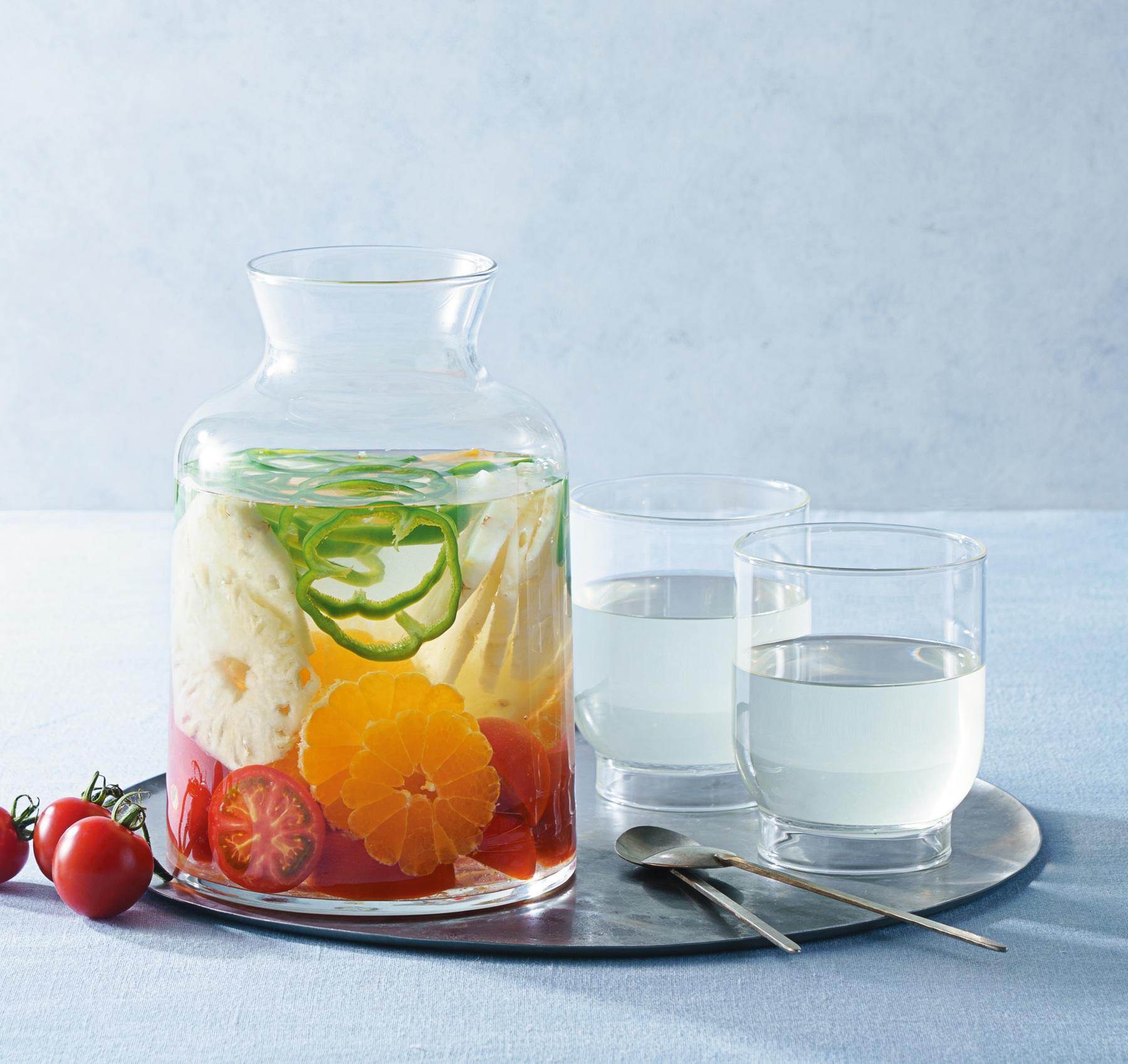 おすすめは水溶性の栄養素を含む食材。柑橘類やベリー類、野菜ならきゅうりやトマトなど。皮ごと使うなら無農薬が理想だが、塩を使って事前にしっかり洗えば安心。気になる人は皮を剥いてもOK。薄切りや細かく切ると栄養素が溶け出しやすくなる。使った食材はそのまま食べても、ジャムやソテーにしても◎。