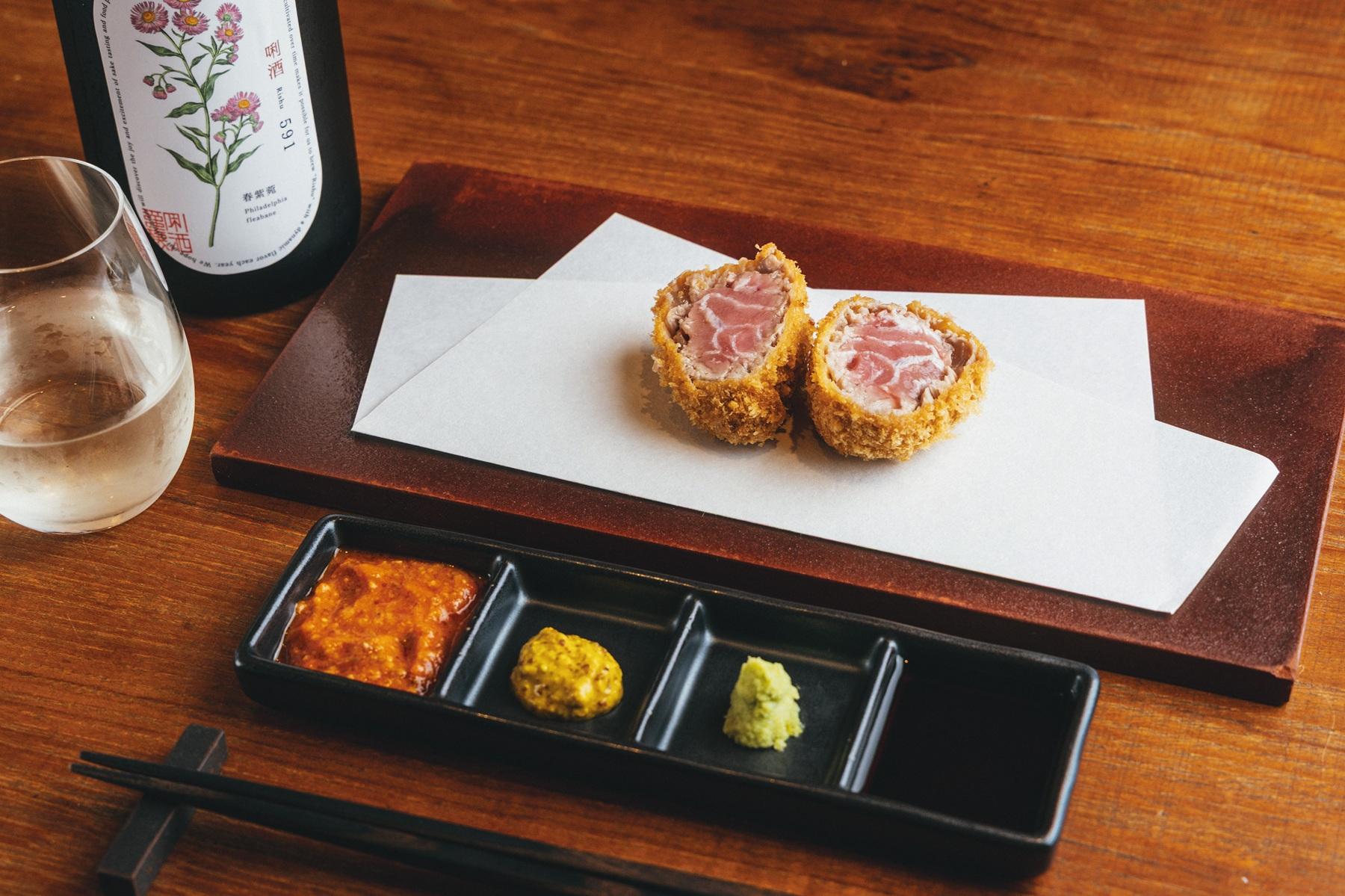 低温と高温でサッと二度揚げされている、やま幸さんより 本マグロのフライ¥1,800。八海山 り(口に利)酒 No.591 ハルジオン(グラス)¥1,300。