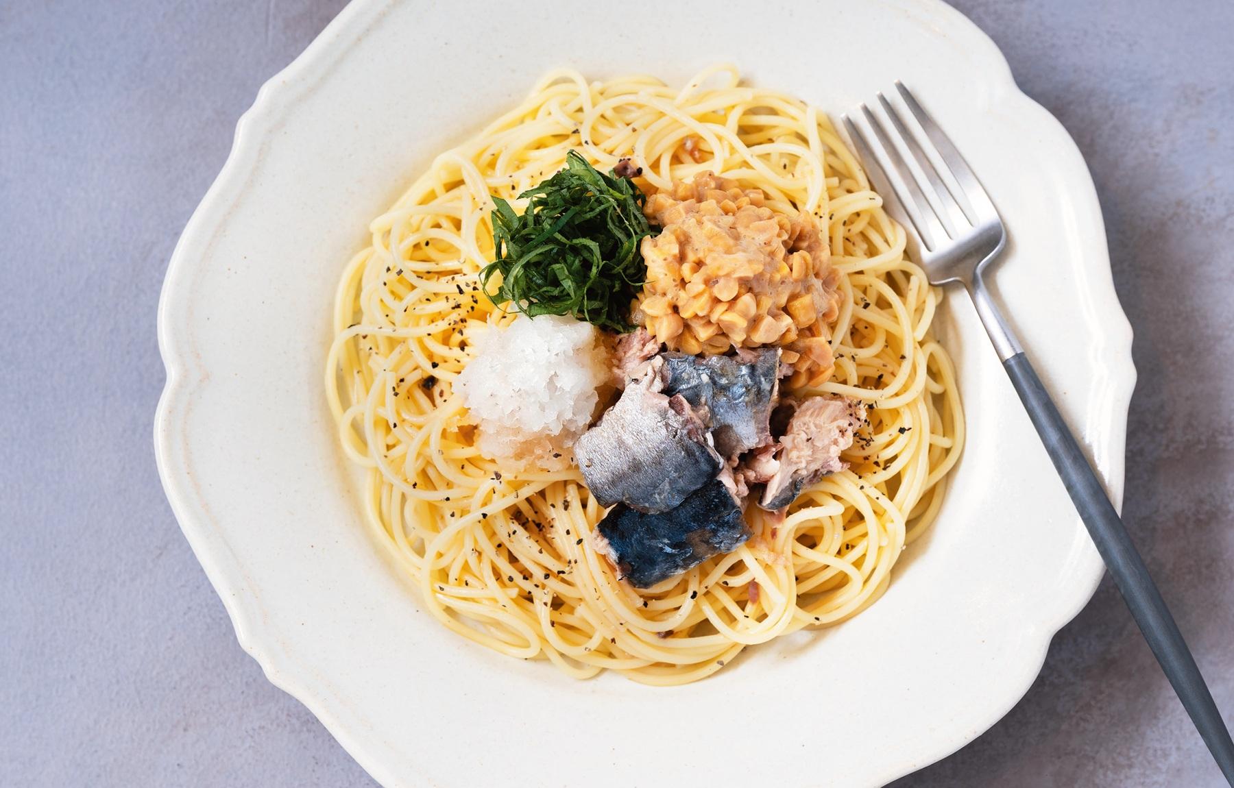 2、スパゲッティを茹でて器に盛り付け、混ぜた納豆と大根おろし、大葉、サバをのせて1のソースをかけ、胡椒を振って完成。