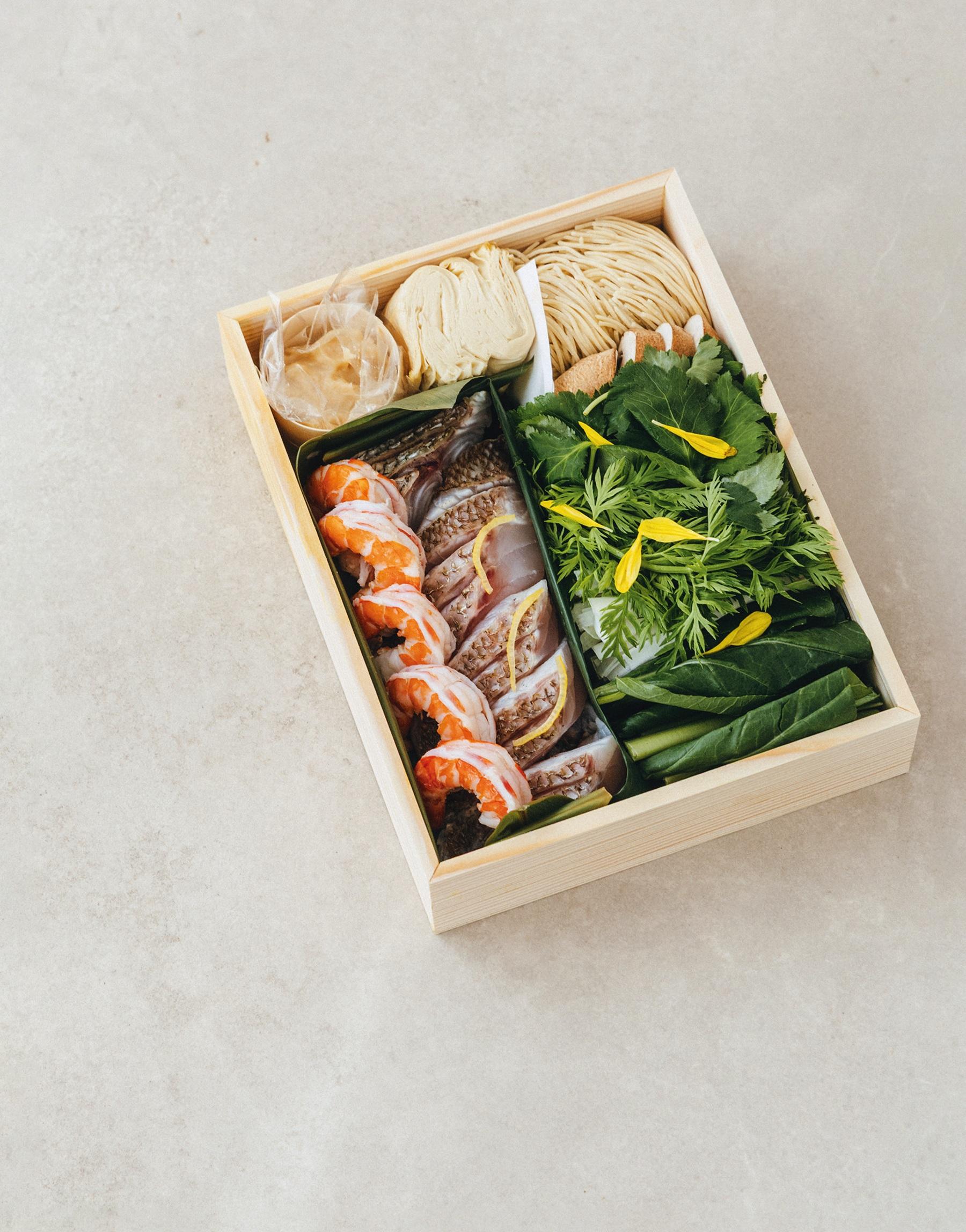 花のように“魚を生ける”をテーマにした美しい魚料理。「京都を訪れる時にお弁当を注文することが多いお店ですが、贈り物なら季節の鍋セットを」。寒さ深まる今は寒鯛と車海老の鍋。まずは鯛のあらと煎り酒のだし汁を楽しみ、白味噌を加えて…2つの味を堪能したい。