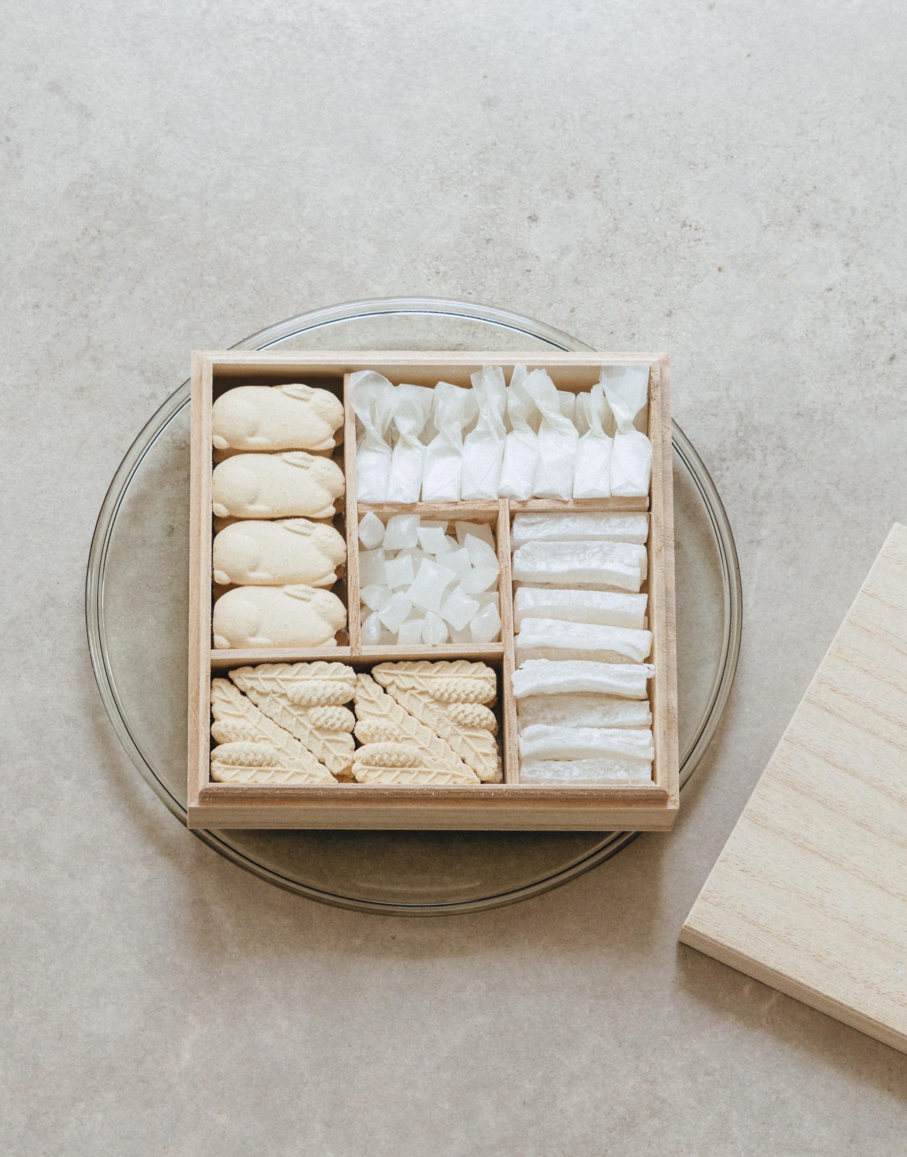 北海道の風景を映し出す和菓子店による美しい干菓子。「ラベンダーや薄荷など北海道らしさのある味わいと、北の大地に広がる雪原を映し出したような情緒があるので、この季節のギフトにもぴったりです」。小サイズもあり。