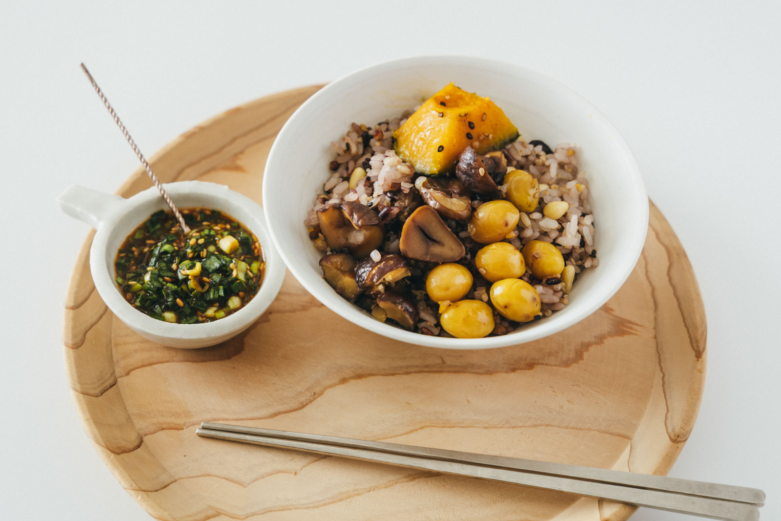 米1合をといで十六穀ごはん1袋(30g)を加えて炊飯器に入れ、水を1合の目盛りまで加える。料理酒大さじ2、昆布4g、松の実15粒、ぎんなん(水煮)8個、甘栗6個、4cm角程度に切ったかぼちゃ50gを入れて炊飯する。炊き上がったら昆布を取り出しさっくり混ぜる。