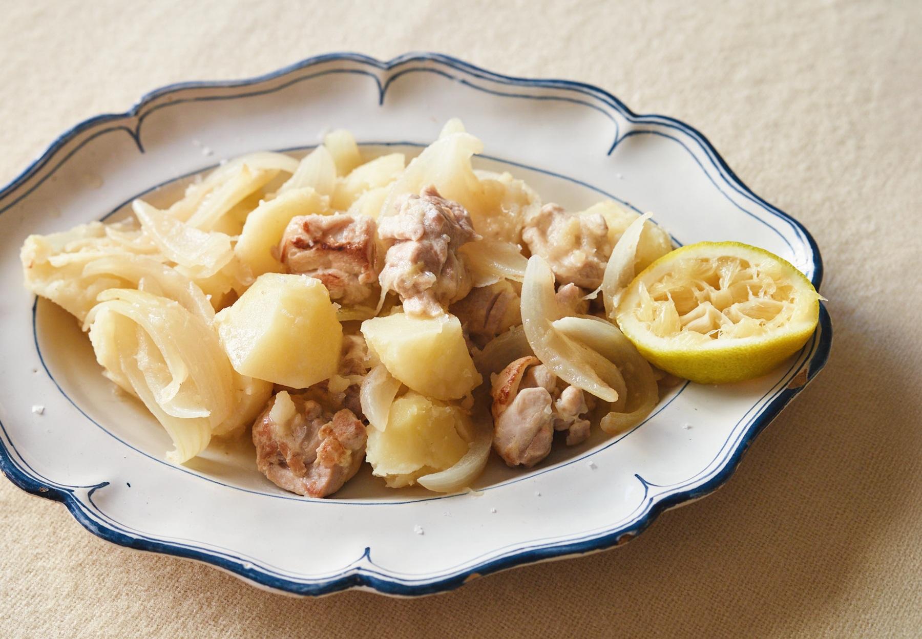 鶏モモ肉…1枚、じゃがいも…3個、玉ねぎ…1/4個、水…200ml、レモン果汁…1/2個分、オリーブオイル…大さじ1、塩…適量