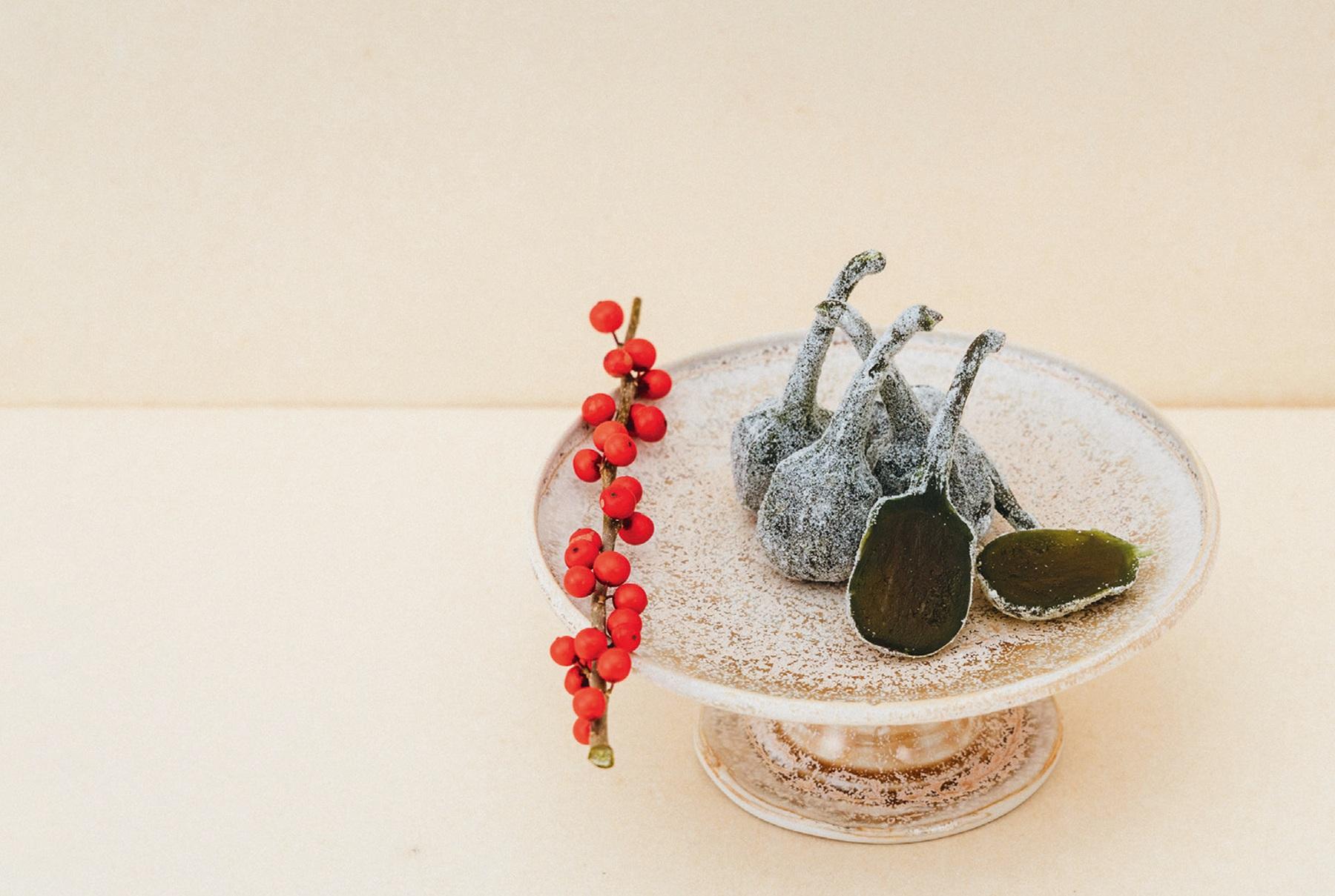 「山形県鶴岡近郊の民田地区には昔から漬物に使っていた小茄子があり、それを長い軸が付いたまま丸ごと砂糖漬けにした珍しいお菓子です。一口噛むとジュワッと甘味が広がり、その後に茄子の風味が押し寄せてきて、お茶請けにも喜ばれます」(畑さん)