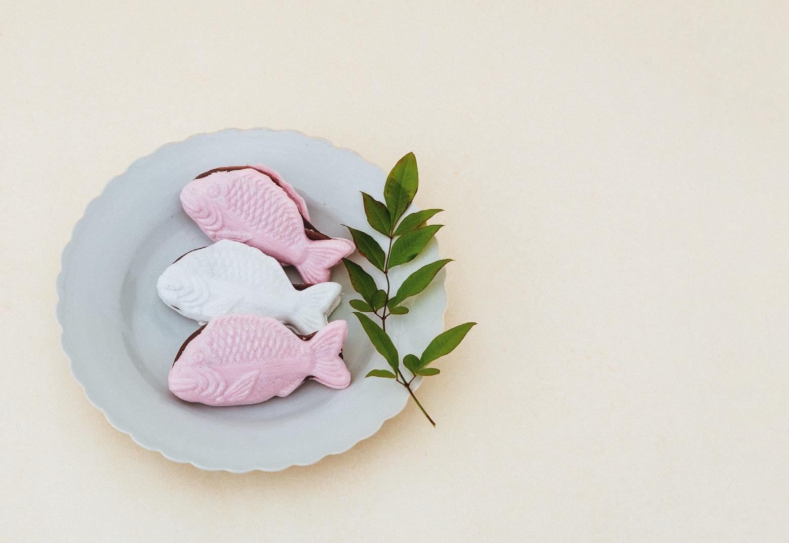 明石名産の鯛にちなんで考案。正月に飛ぶように売れる、鯛の形をした紅白のもなか皮で餡をふんわり包んだ祝い菓子。