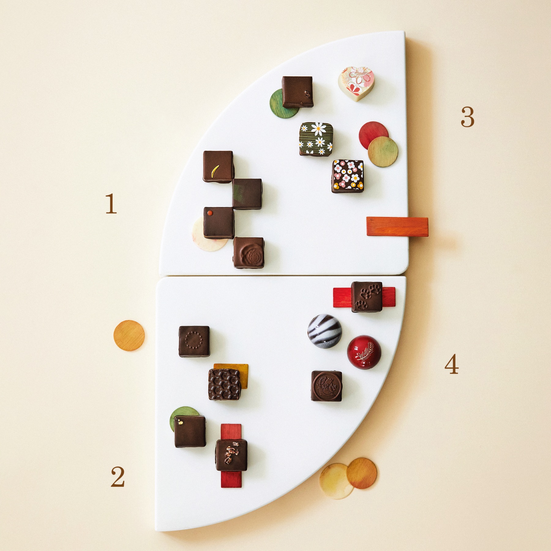 ① LA BASE de Chez Lui SYNC. 4個入り ¥2,592 ② TERROIR by Daichi Okuno セレクション 8個入り ¥3,800 ③ Chocolaterie lys ボンボンショコラ 6個入り ¥2,610 ④ amazoonia ボンボンアソート 6個入り ¥3,240