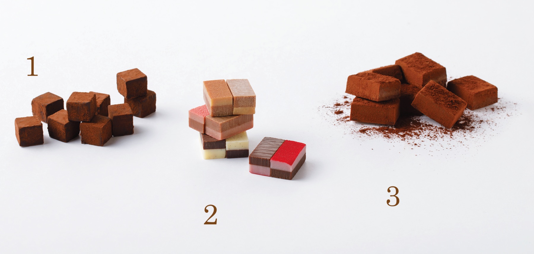 ① DANDELION CHOCOLATE シングルオリジン・生チョコレート 貴醸酒 16個入り ¥2,800 ② DelReY プレミアム生チョコレートボックス ハーモニアス 8個入り ¥2,160 ③ ROYCE’ 生チョコレート ロイズファームトゥーバー 20粒入り ¥1,215