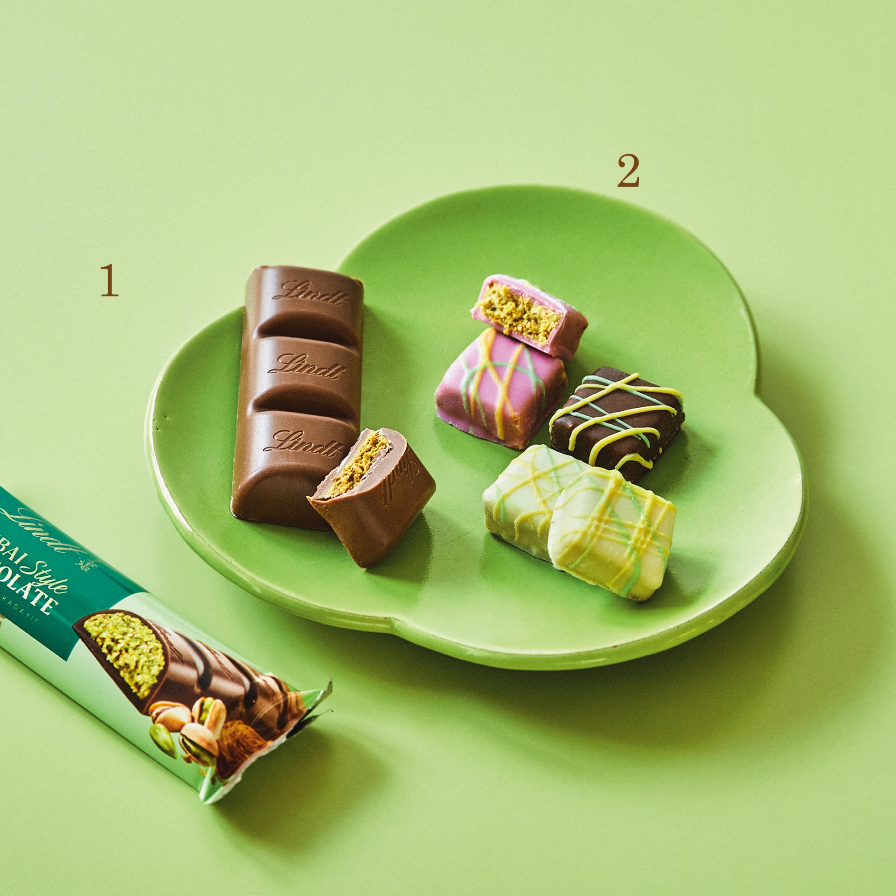① Lindt リンツドバイスタイルチョコレート バー 1個 ¥1,300 ② divan ピスタチオドバイチョコレートプラリネアソート 6個入り ¥3,240