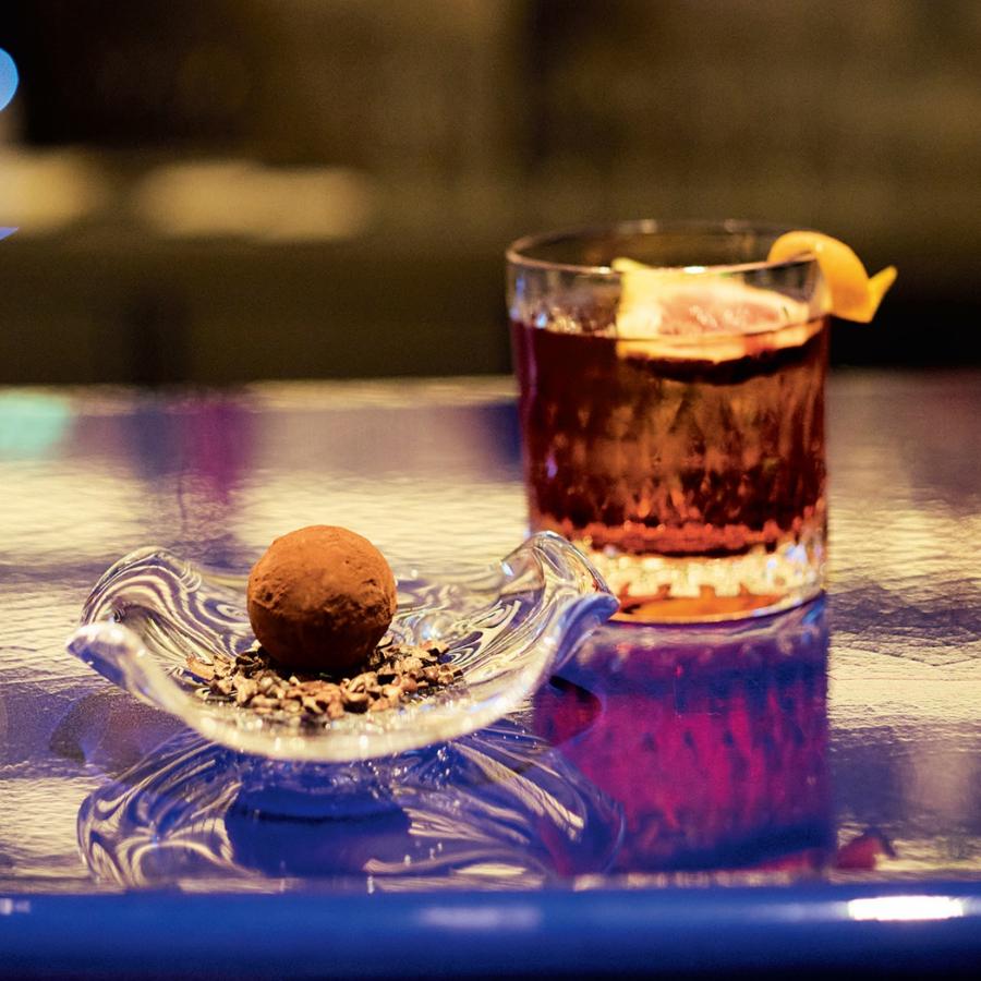たとえば、極限までなめらかにしたみずみずしいガナッシュを閉じ込めた「ショコラ・コキーユ」には、ビターなカクテル、ネグローニを。やわらかな甘さのチョコレートをネグローニのほろ苦さが包み込み、カカオの余韻はより深く、エレガントな大人のデザートへと昇華する。