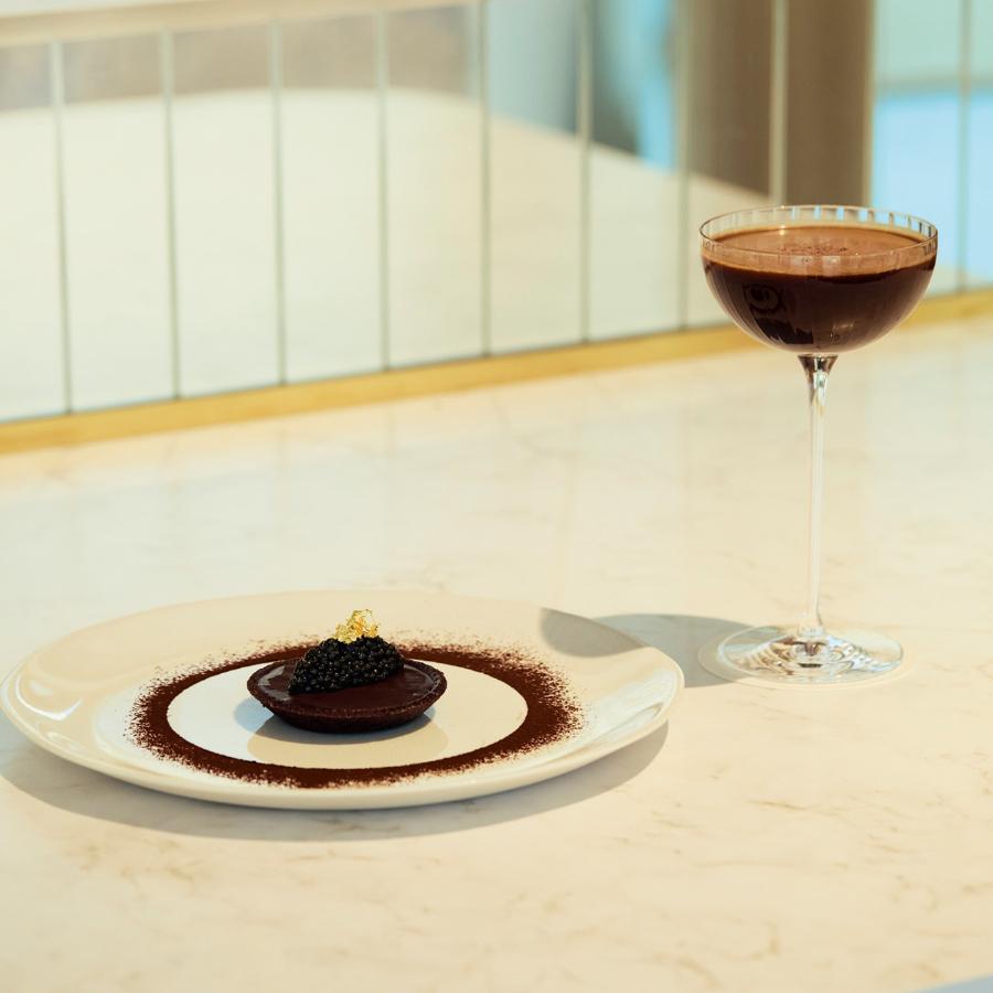 その挑戦が、フレンチの食材とチョコレートを組み合わせるというアプローチ。一見大胆に思えるが、「タルト ショコラ キャビア」を口にすると納得。ダークチョコレートの甘さと苦味に、キャビアの塩味とミネラル感が重なり、互いの輪郭を引き立て合うバランスが絶妙。そこへ「マティーニ ショコラ」をひと口。カカオの風味にブランデーの熟成香が重なり、味わいは一段とまろやかに広がっていく。