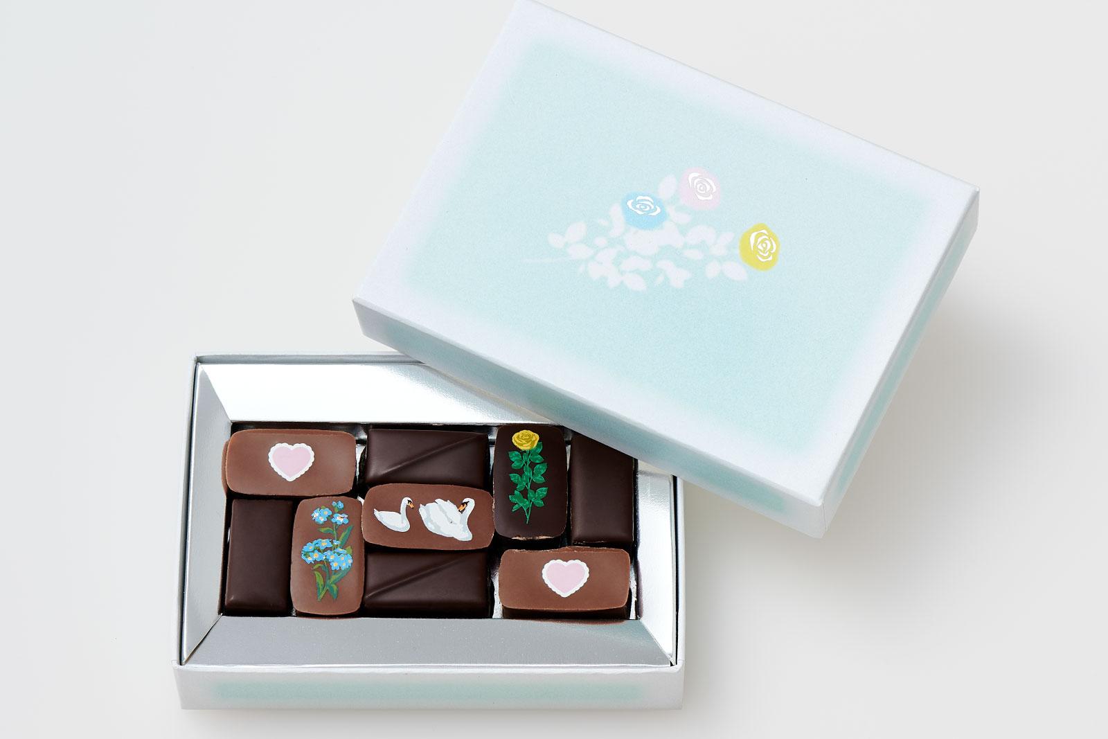 「ルル メリー」のバレンタインコレクションのテーマは“朝露”。淡いブルーの箱を開けると、ハートや花、白鳥をプリントしたチョコレートが鎮座。ローズやシトラスカモミール、ミックスベリーなどのフレーバーチョコが楽しめる。9個入り ¥3,564(ルル メリー/メリーチョコレートカムパニー TEL. 0120-160-361)