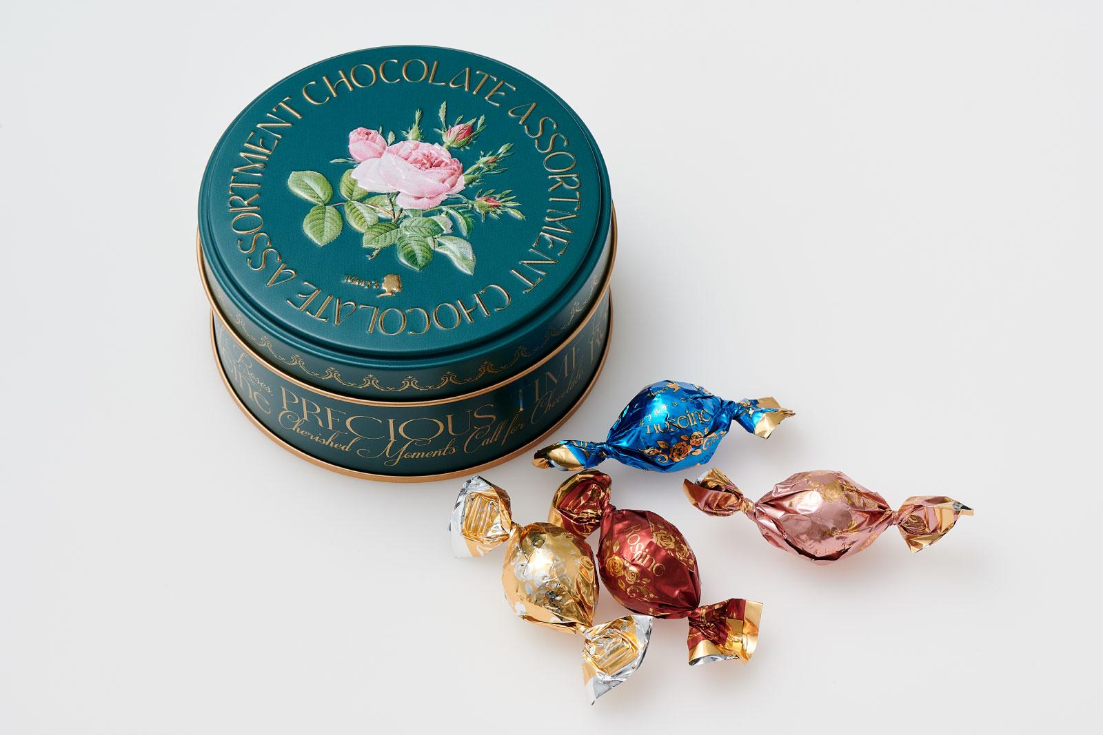 レトロなバラが麗しい缶の中に、キラキラ輝くチョコたちが。