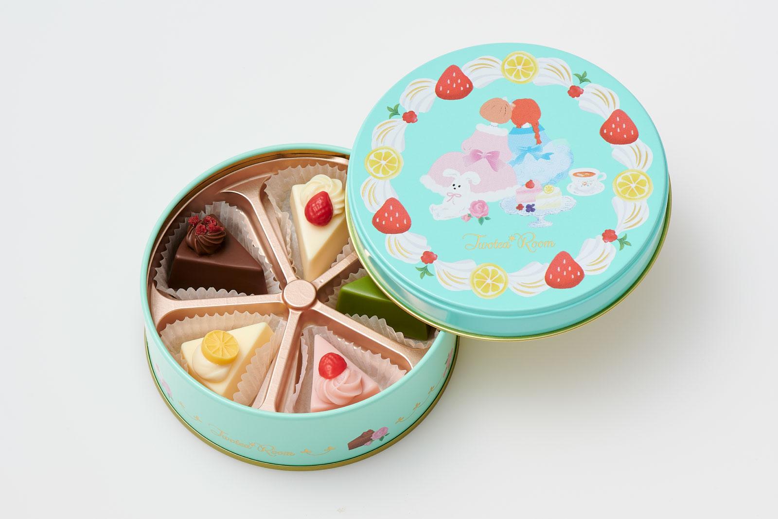 1923年創業、神戸の老舗洋菓子メーカーが作るチョコレート。テーマは“アフタヌーンティーをたしなむ2人の女の子”で、女の子やうさぎ、クリームが描かれた缶のフタをとると、ケーキのようなキュートなチョコレートがズラリ。さまざまなフレーバーが味わえるのも嬉しい。 5個入り ¥1,512(ゴンチャロフ製菓 TEL. 078-881-1188)