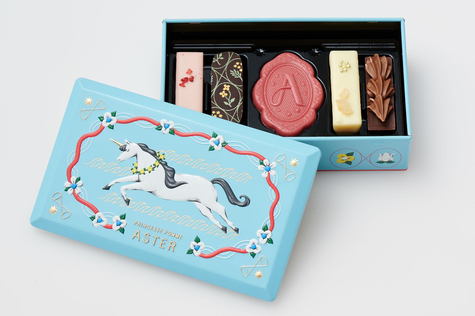 新ブランド「りんごひめアステル」は、“りんごに恋した女の子・アステル”がテーマ。特におすすめは、ユニコーンが描かれた缶にチョコレートが入ったこちらの品。アステルが編むクロッシェモチーフでユニコーンのたてがみを表現したチョコのセット。すべてがかわいい!! 5個入り ¥1,026(モロゾフ TEL. 078-822-5533)