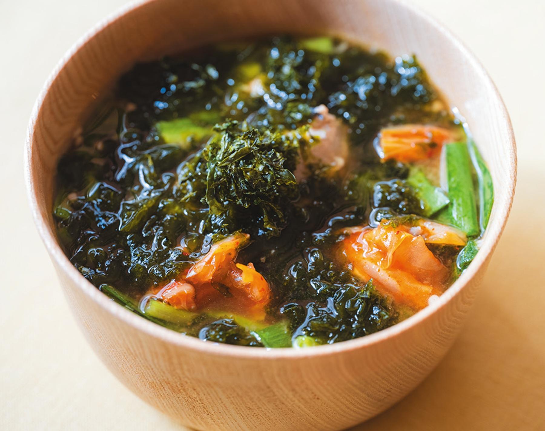 「ストレス解消は冷え取りがカギに。サバは、『気』と『血』の流れを良くし、体を温め、巡りを良くしてくれる食材です。ニラは春の季語でもあり、別名『起陽草』と呼ばれ、陽気を起こすスタミナ薬草として有名です。キムチや生姜などの辛味は元気を与え、全身のエネルギーの巡りを整えてくれるので、この一杯でポカポカに!」