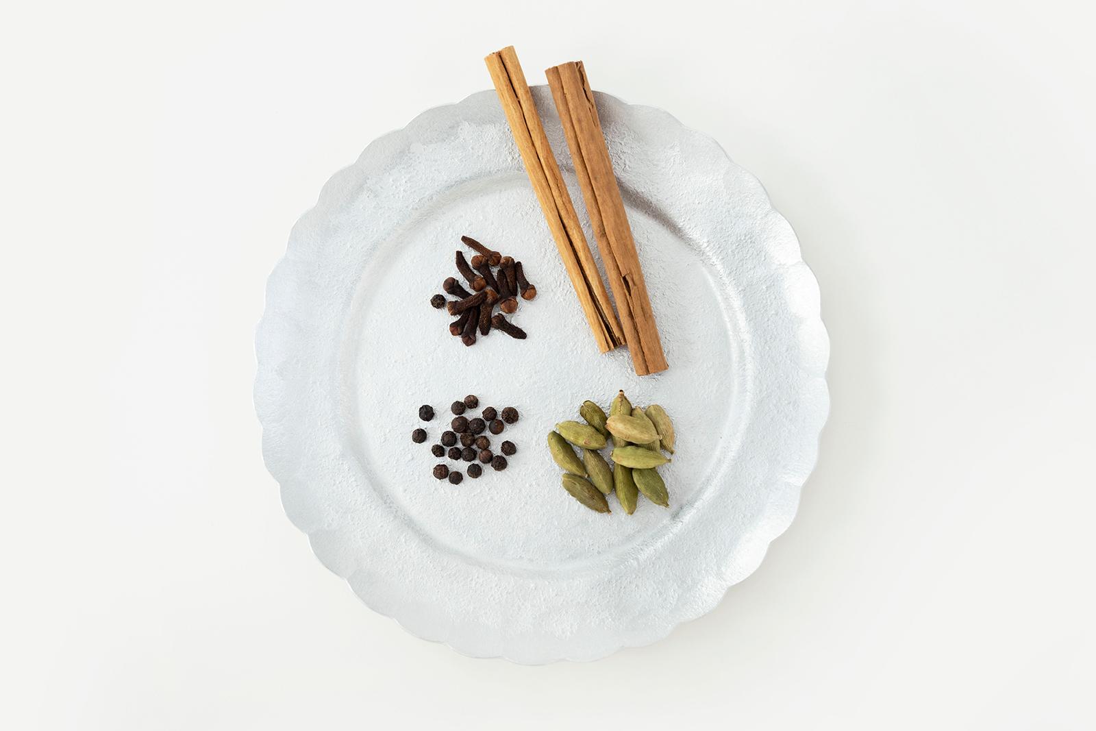 今回使用するスパイスはこちら。左上から時計周りにクローブ、シナモン、カルダモン、ブラックペッパー。