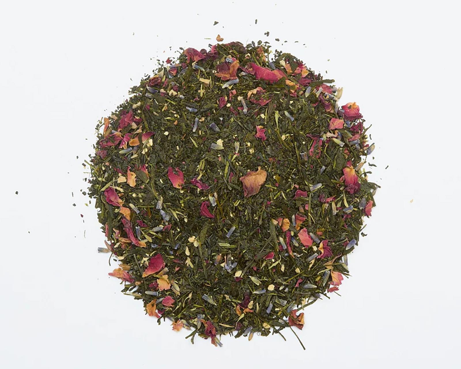 富士山麓の爽やかな緑茶に、ローズ、千葉契約農園のショウガ、ラベンダーをブレンドした、緑茶ベースのボタニカルティー。