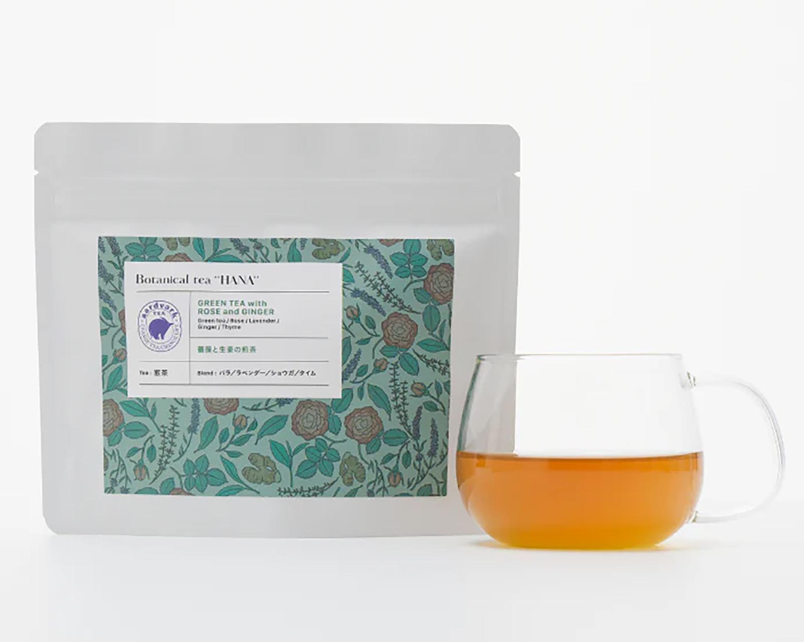 静岡県富士市「富士山まる茂茶園」の茶葉を使用した「ボタニカルティーHANA 薔薇と生姜の煎茶」30g ¥1,780。公式サイト