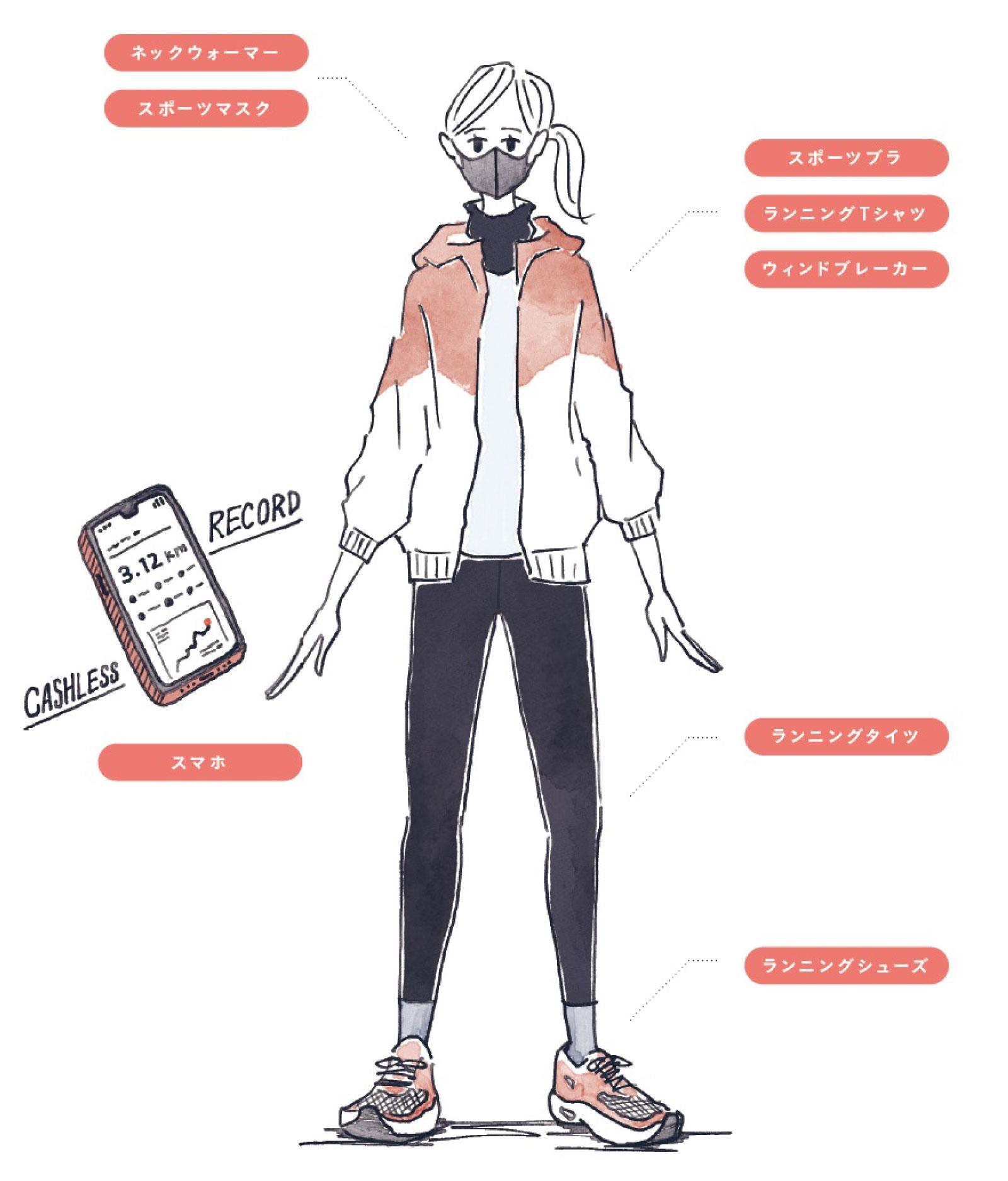 続けるか分からないから、試しに手持ちのアイテムで走ってみよう、と思っている人がいたらちょっと待って! 「少しでも走るなら、最低限のウェアとシューズはきちんと準備しましょう。お試しだからいいやと、タウンユースのスニーカーなどランに適さないギアで走ると、ケガや不快感につながり、走る楽しさ以前に、苦痛で挫折することがあるからです」(真鍋さん)。イラストの着用アイテムが、理想の一式。とくにシューズはマスト。