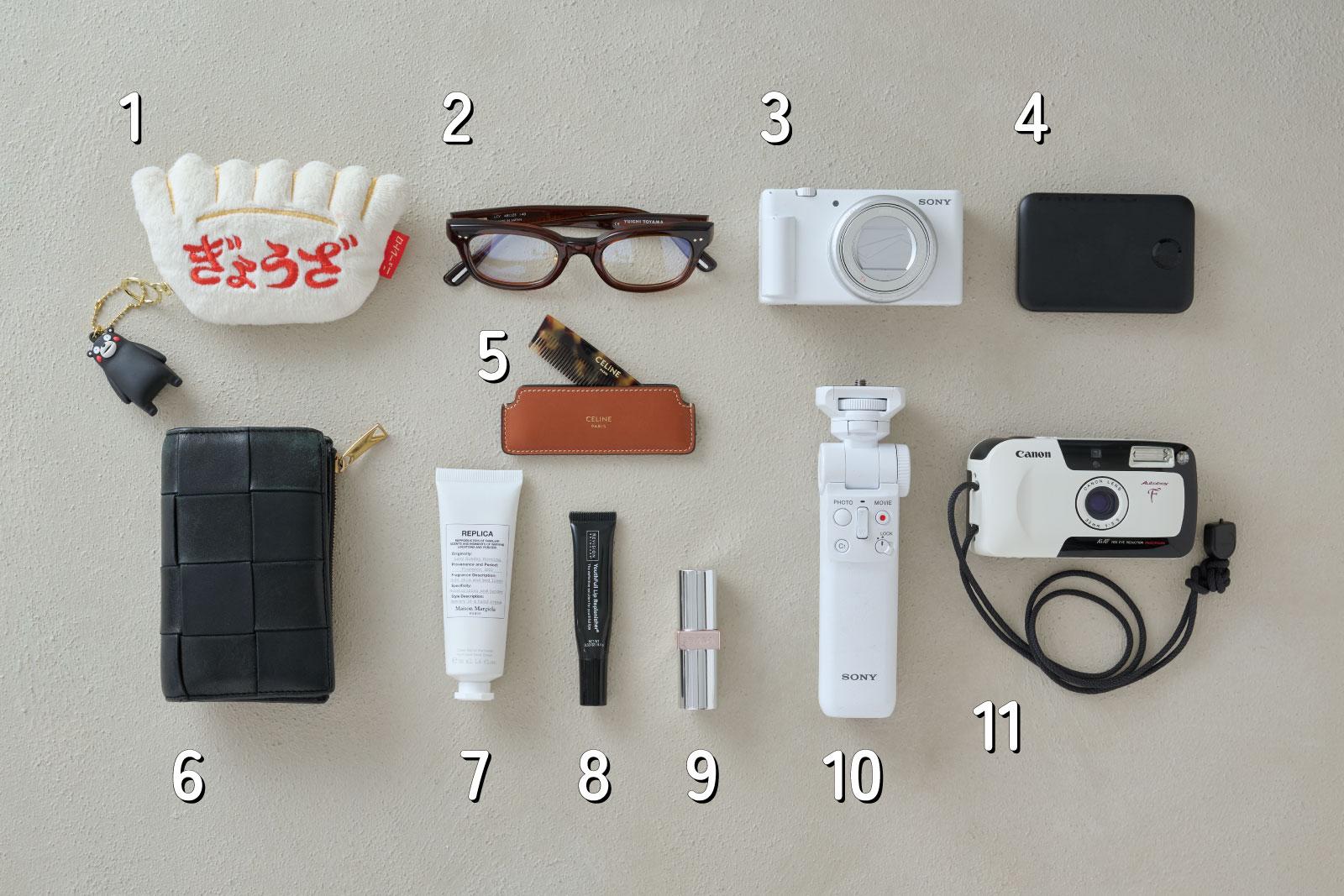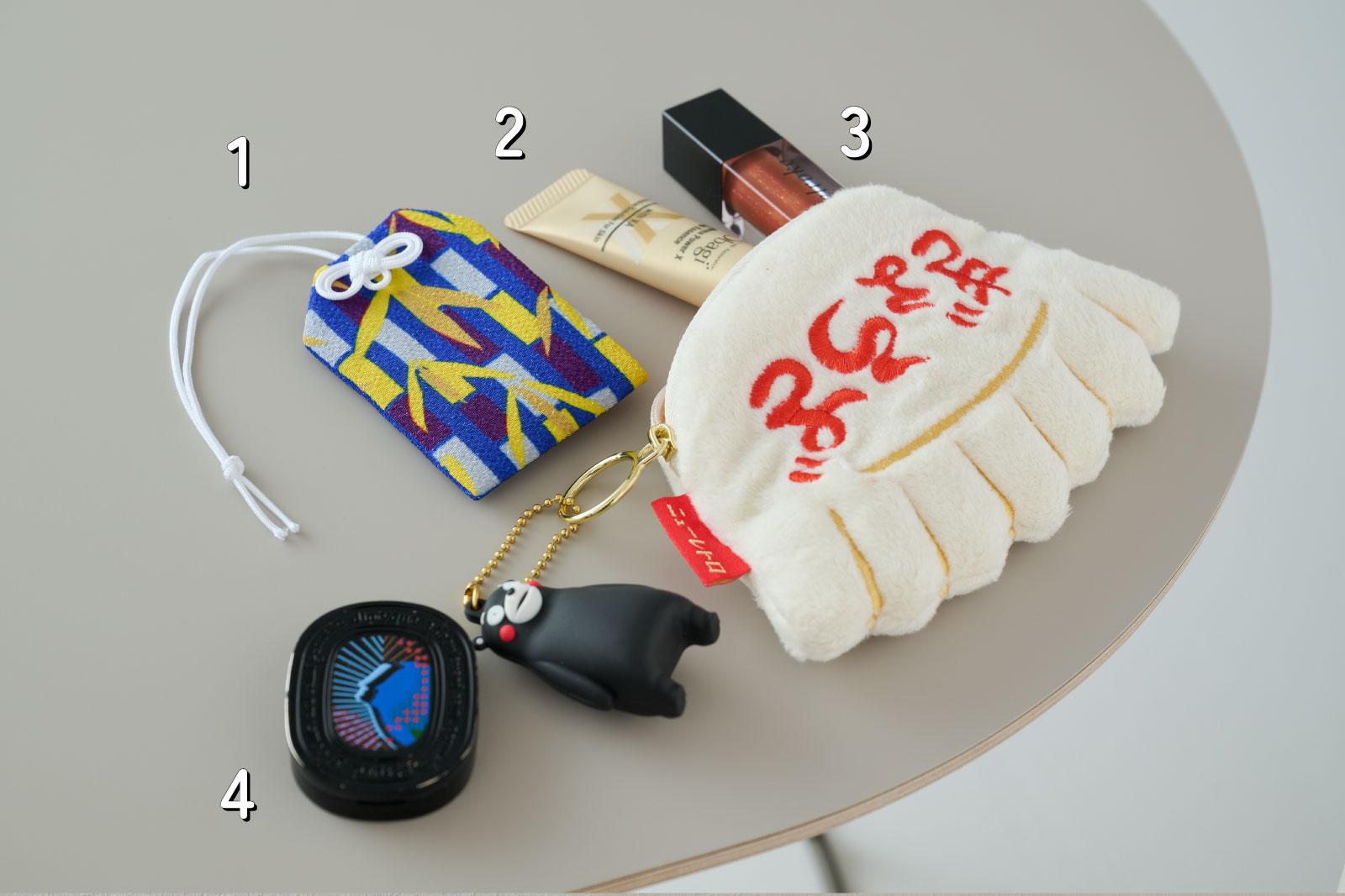 1. “ぎょうざ”ポーチ 地元に帰省しているときに、札幌駅のショッピングモールで買いました。ぎょうざのカタチがかわいくて、ひとめぼれ。なかには、とっておきの小物を入れています。ジップにつけている“くまモン”は、熊本の友達からのお土産です。