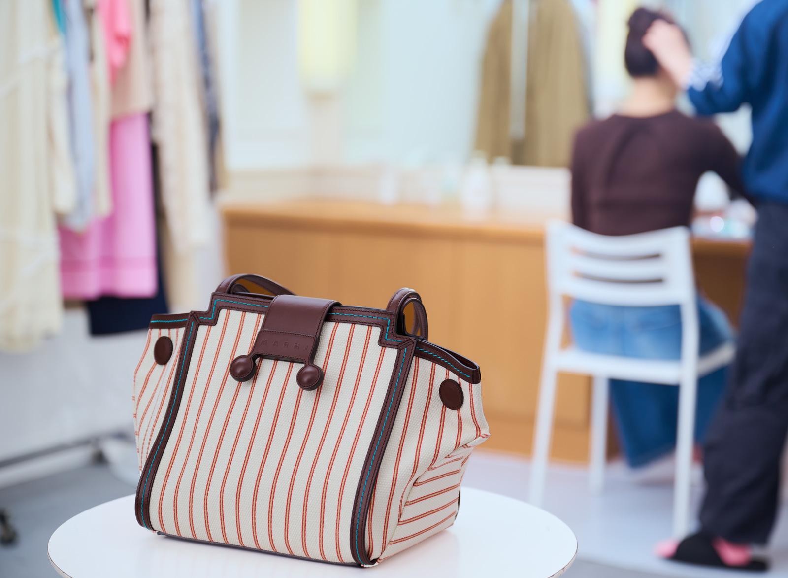 スタジオでの撮影の日。花山さんが持ってきたのは、赤と白のストライプが目を引くマルニのバッグ。