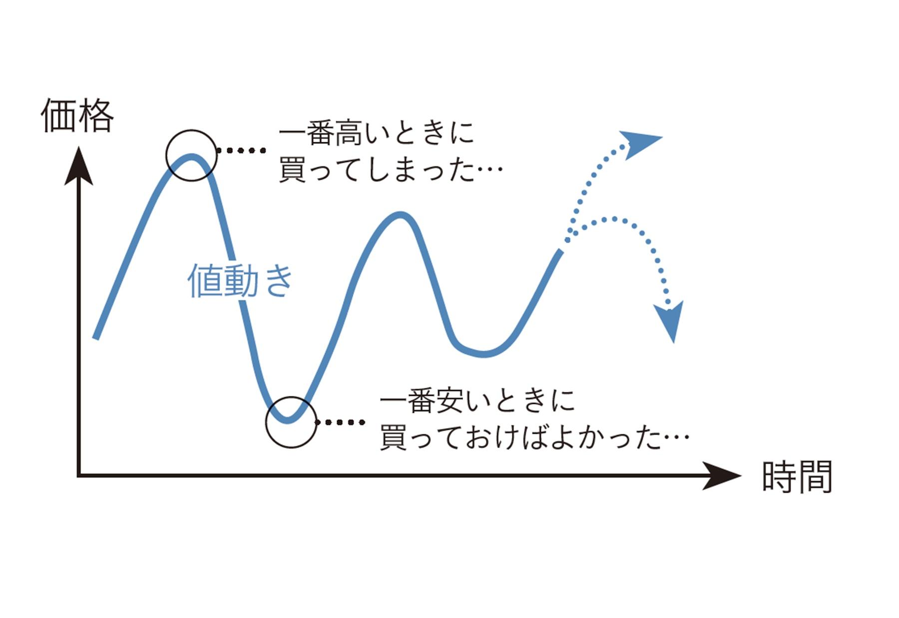 相場は上がったり、下がったりを繰り返していくもの。「これをうまく利用するのが積み立てです。毎月1万円ずつ積み立てで買うと、相場が高いときには少なく、下がっているときは多く買えます。すると平均購入単価が抑えられ、結果的に相場変動のリスクを軽減することにつながり、利益を出しやすい資産を作れます」