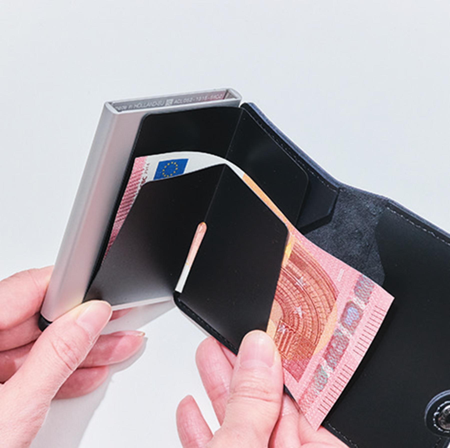 カードが約6枚収納できるアルミ製のケースを搭載。底部のレバーを動かすと、カードが飛び出して自動的に整列し、必要なカードを素早く取り出せる。紙幣を挟むクリップもあり。W6.5×H10.2×D2.1cm¥13,200(セクリッド/Smith東京ミッドタウン日比谷 TEL:03・6550・8343)