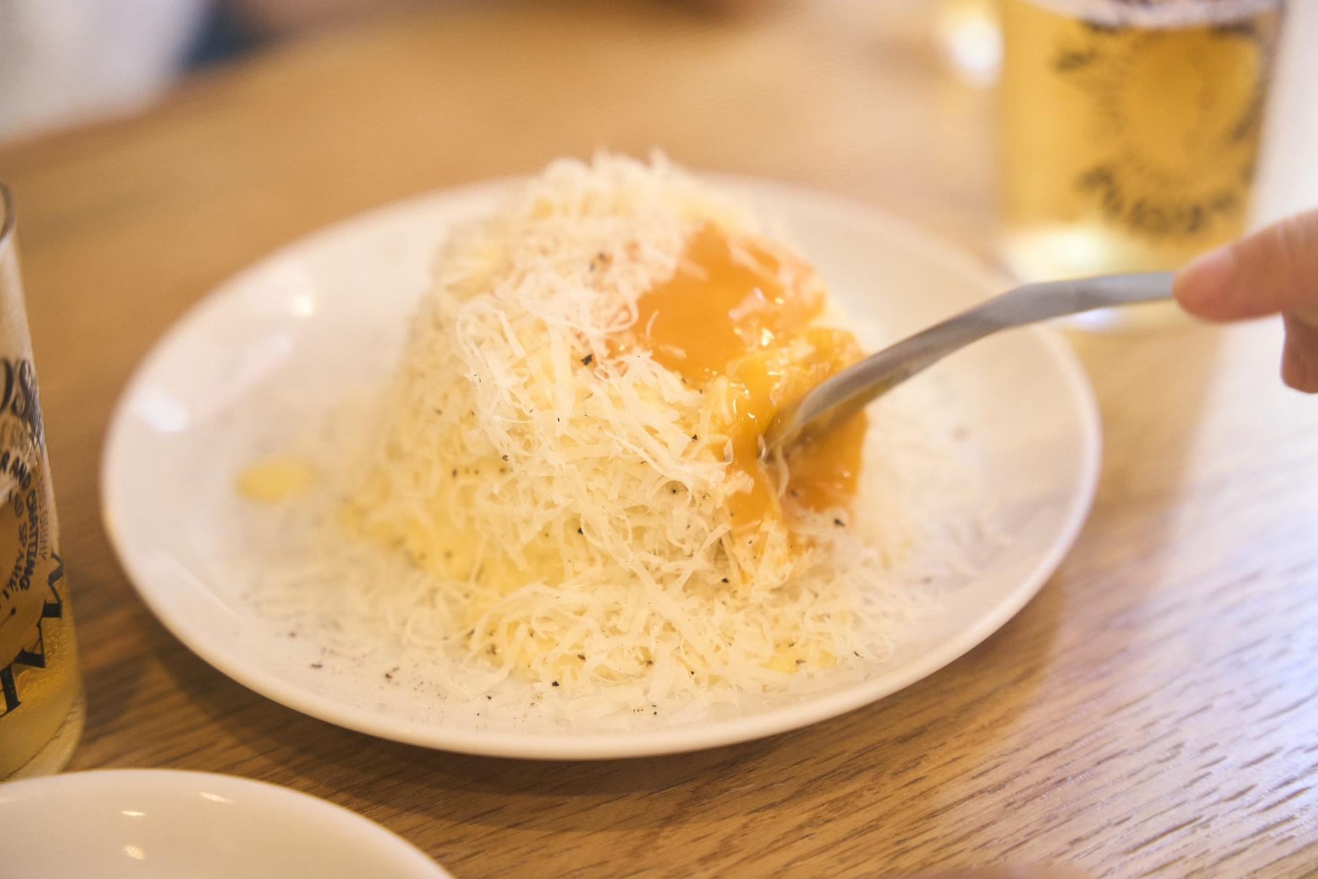 お店で人気のインカのめざめのポテトサラダ(680円)。たっぷりまぶされたチーズの山を崩すと現れる卵黄。シンプルながら味わいはまろやかで美味…!