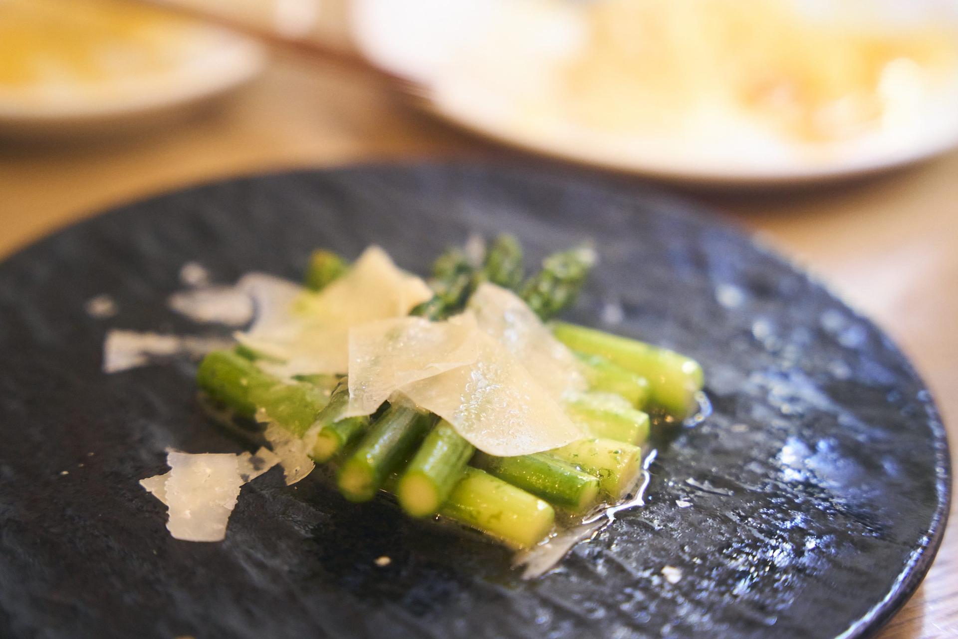 磯の香りを感じながら、海苔バターで炒めたアスパラガスをひと口(880円)。
