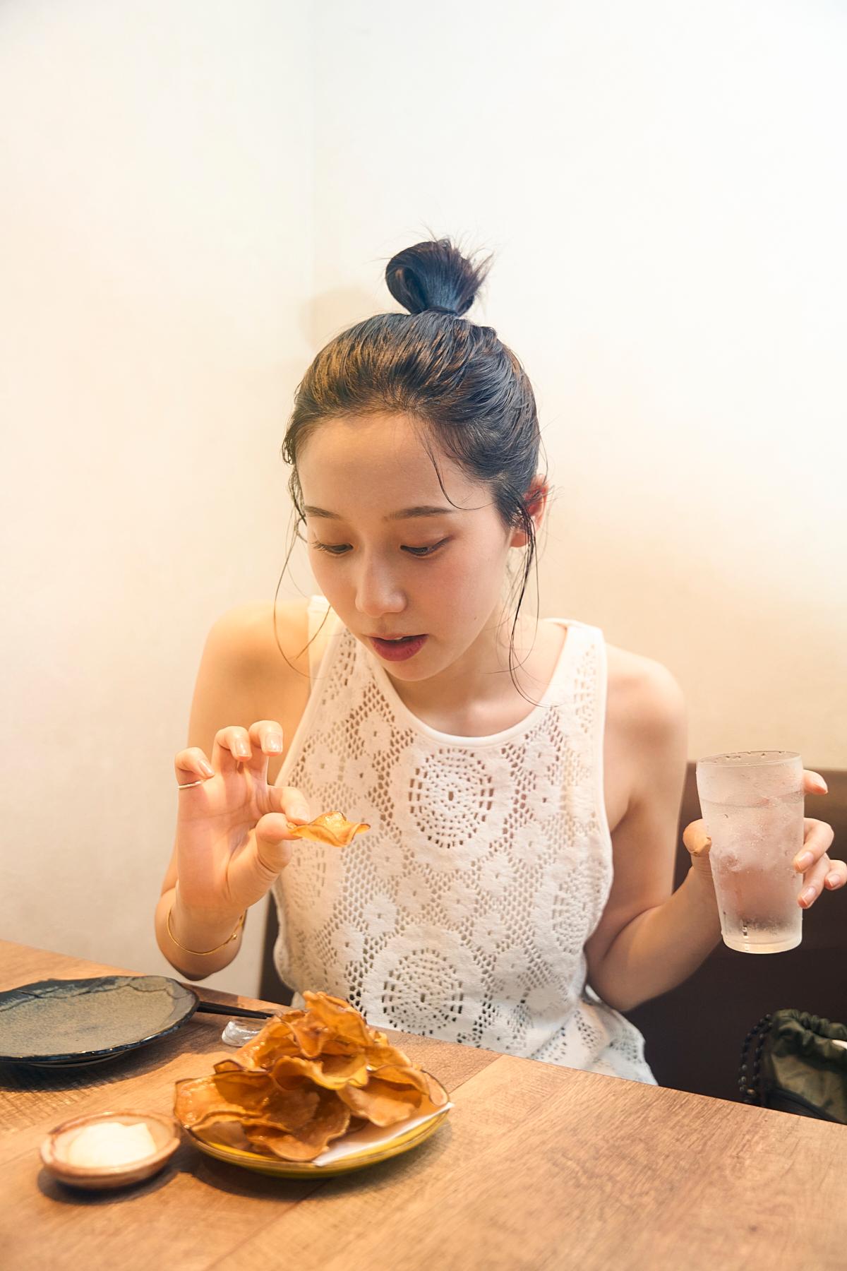 ジン(780円)を片手に、さつまいもチップスで小休憩。マスカルポーネソースのクセになる甘みとバターの塩み、最高♡